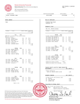 This transcript from Boston University documents Alexander Ascher's academic record. It shows that he is pursuing a Bachelor of Arts in Marine Science and has earned 109 credits with a cumulative GPA of 3.49. The transcript lists the courses Ascher has taken each semester, the credits earned, and grades received. It also indicates that he was on the Dean's List and received transfer credits from Cornell University and advanced placement credits in high school. The transcript is signed by the Assistant Vice President and University Registrar and contains information about Boston University's grading system, course numbering, and accreditation.