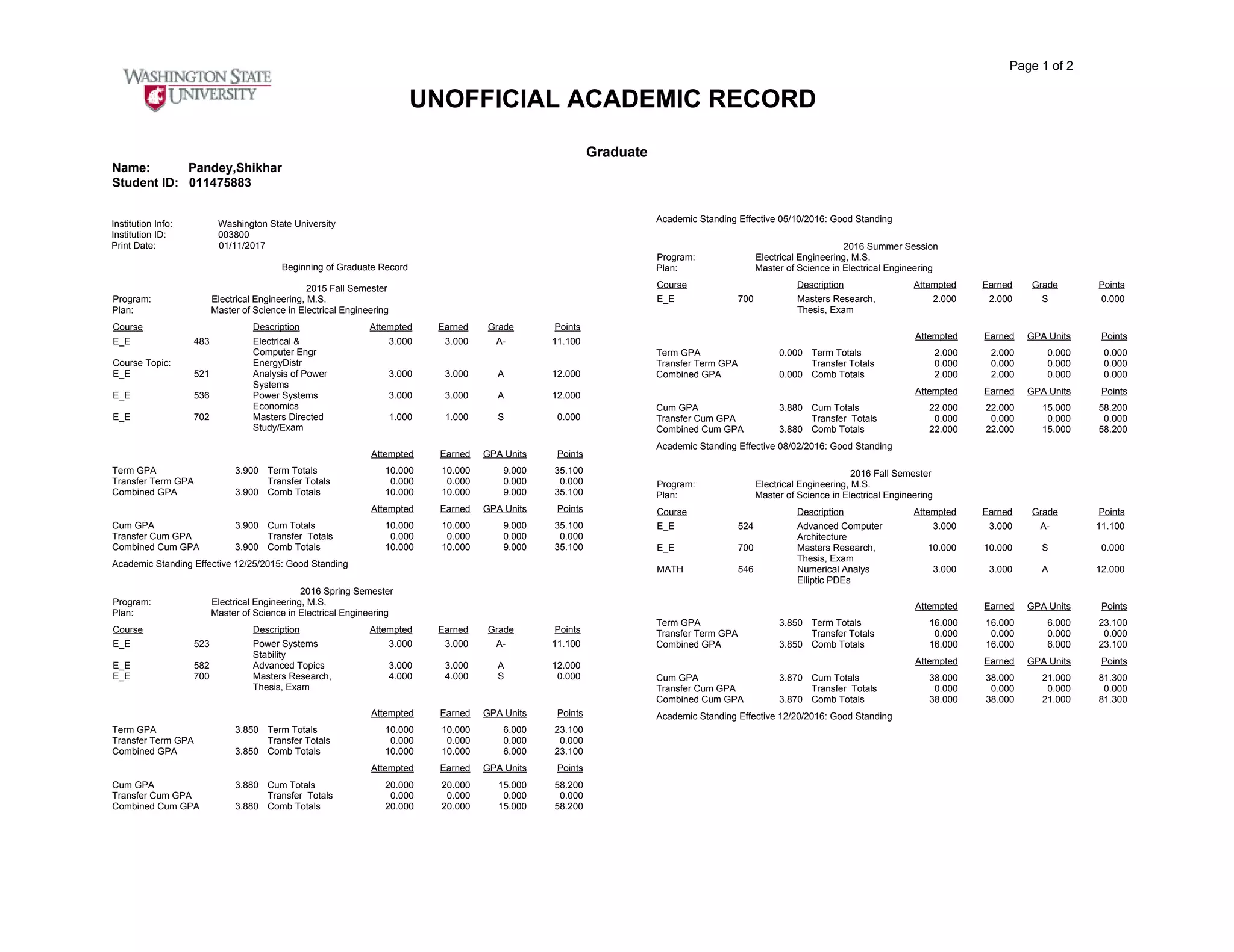This document is an unofficial academic record for Shikhar Pandey showing his coursework and grades while pursuing a Master of Science in Electrical Engineering at Washington State University. Over six semesters from 2015 to 2017, Pandey completed 38 credit hours with a cumulative GPA of 3.870. His coursework included classes in electrical engineering, power systems, computer architecture, and numerical analysis. He maintained good academic standing throughout his graduate career.
