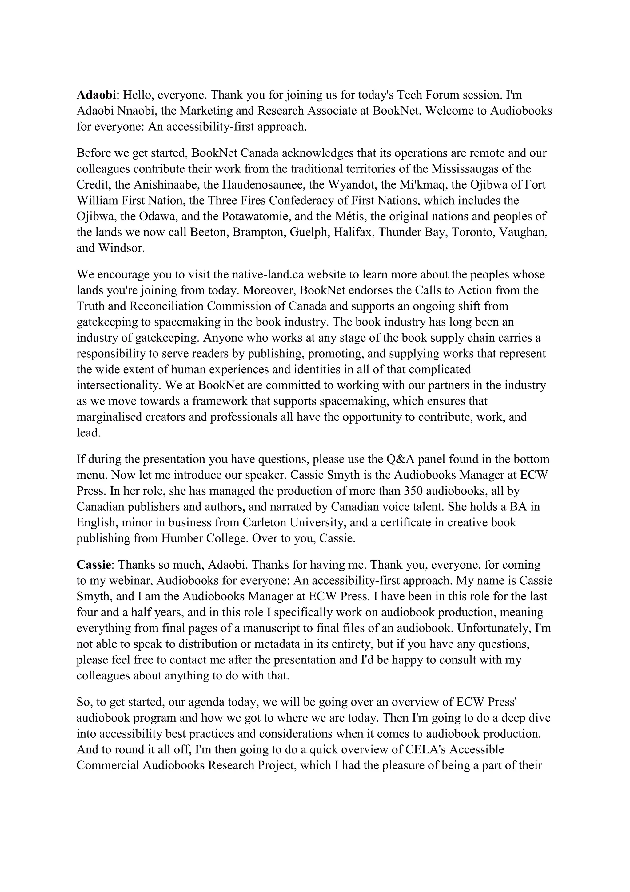Join us for a behind-the-scenes look at audiobook production with a focus on accessibility. Cassie Smyth, Audiobooks Manager at ECW Press, will share insights into ECW’s approach to creating born-accessible audiobooks, how their workflows are structured, what they focus on, and what’s next for their team. Whether you’re looking to expand into audiobooks or want to learn from a publisher leading the way in accessible audiobook production, this session is for you.