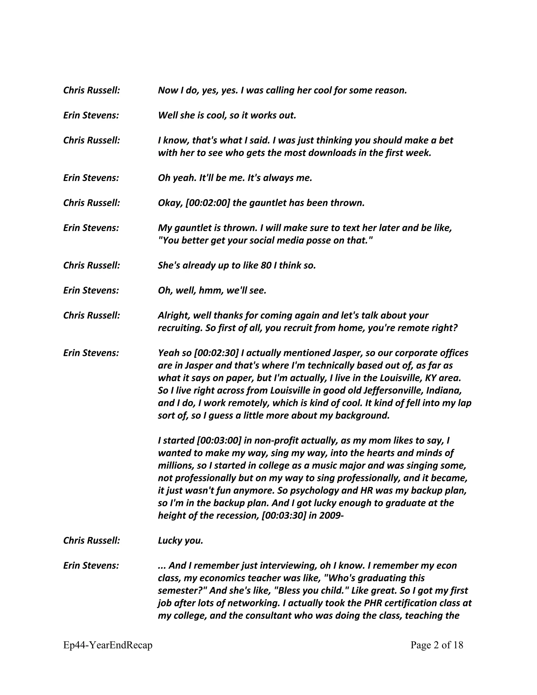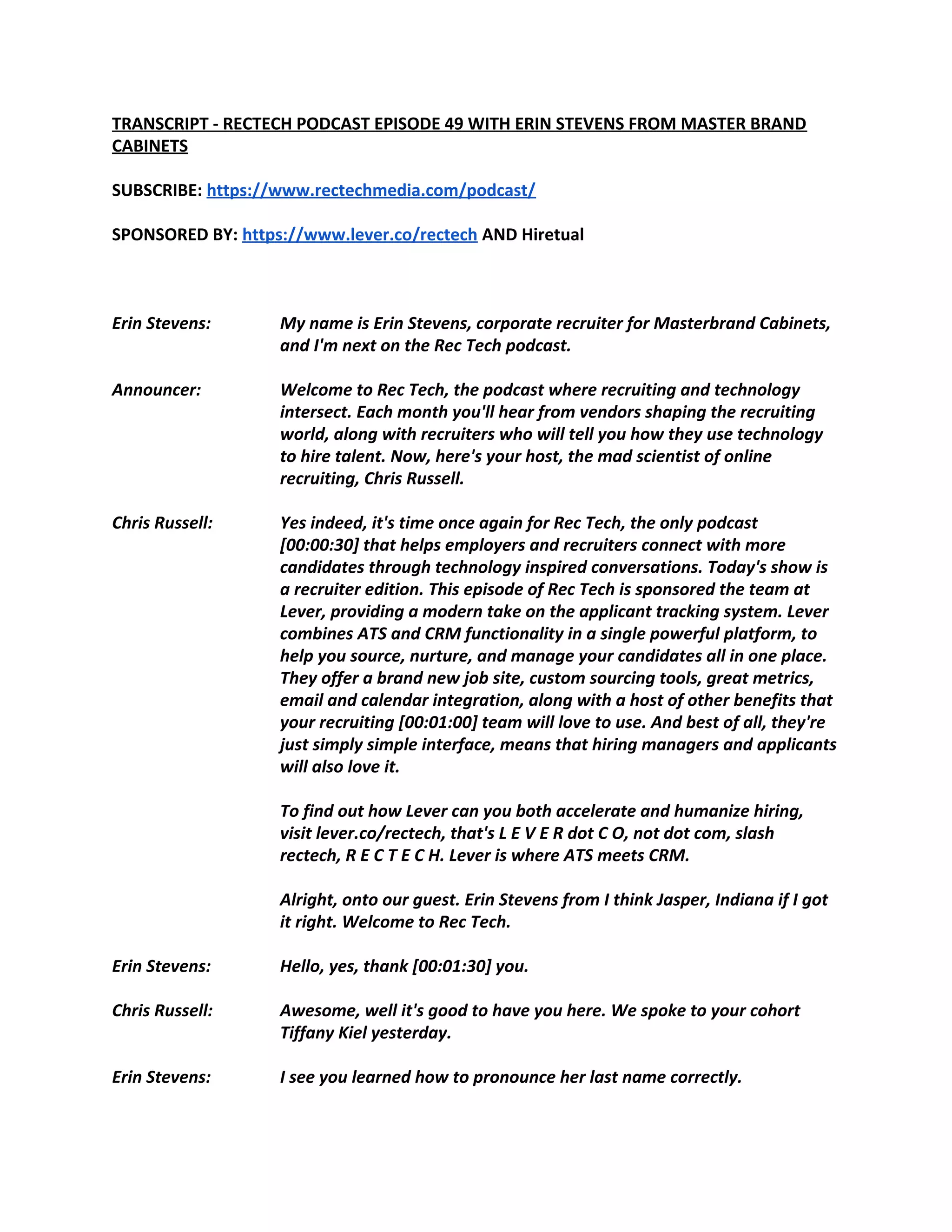 This transcript summarizes a podcast episode interviewing Erin Stevens, a corporate recruiter for Masterbrand Cabinets. Erin discusses working remotely from her home in Louisville, Kentucky for a company based in Jasper, Indiana. She uses tools like Skype, Zoom, email and chat to stay connected with colleagues. Zoom has been particularly useful for video conferencing team meetings and candidate interviews to reduce travel costs and time.