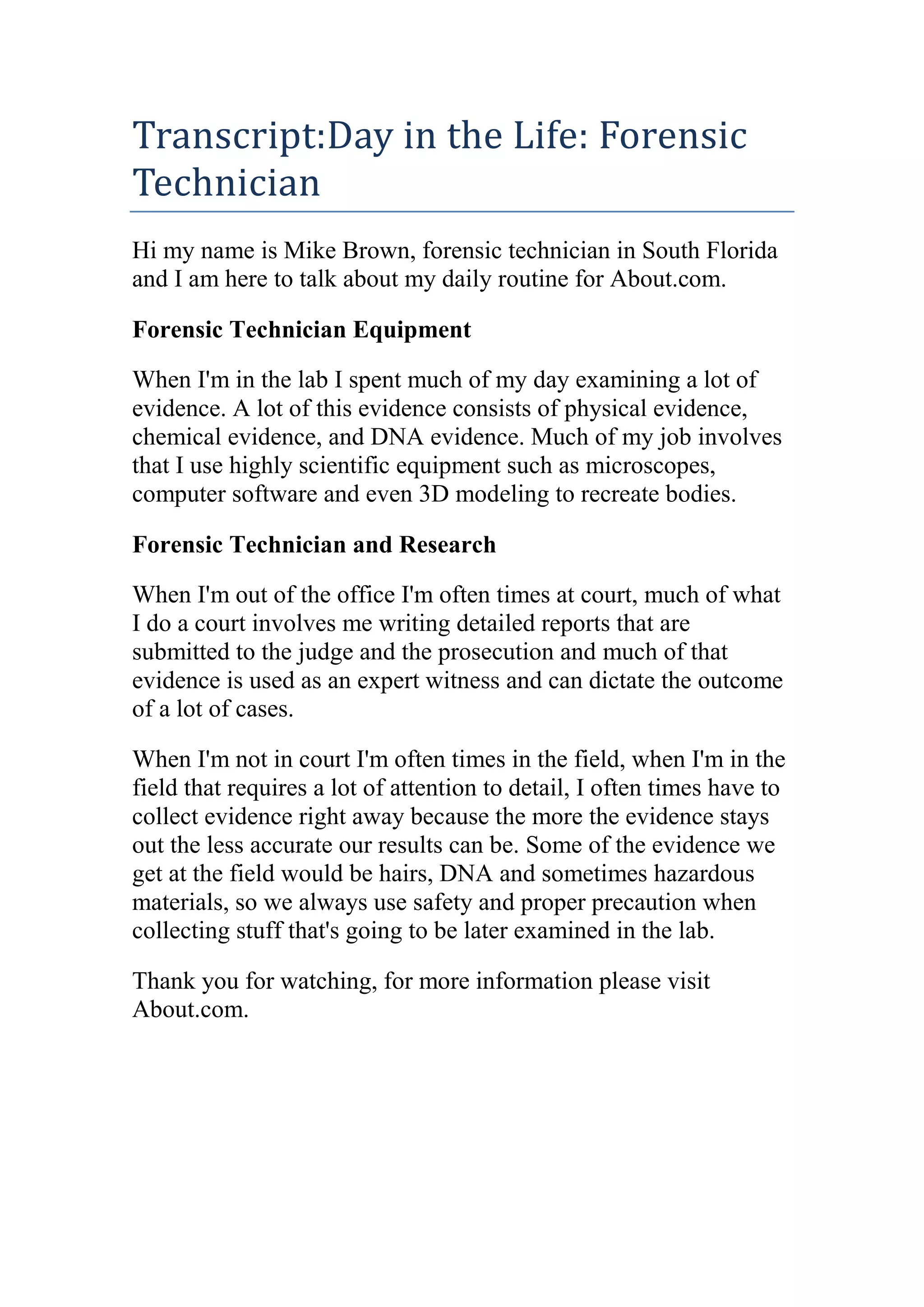Mike Brown is a forensic technician in South Florida. He spends his days in the lab examining physical, chemical, and DNA evidence using scientific equipment like microscopes and computer software. When not in the lab, he testifies as an expert witness in court based on detailed reports. In the field, he collects evidence immediately to preserve accuracy, gathering materials like hairs and DNA while taking safety precautions for hazardous substances.