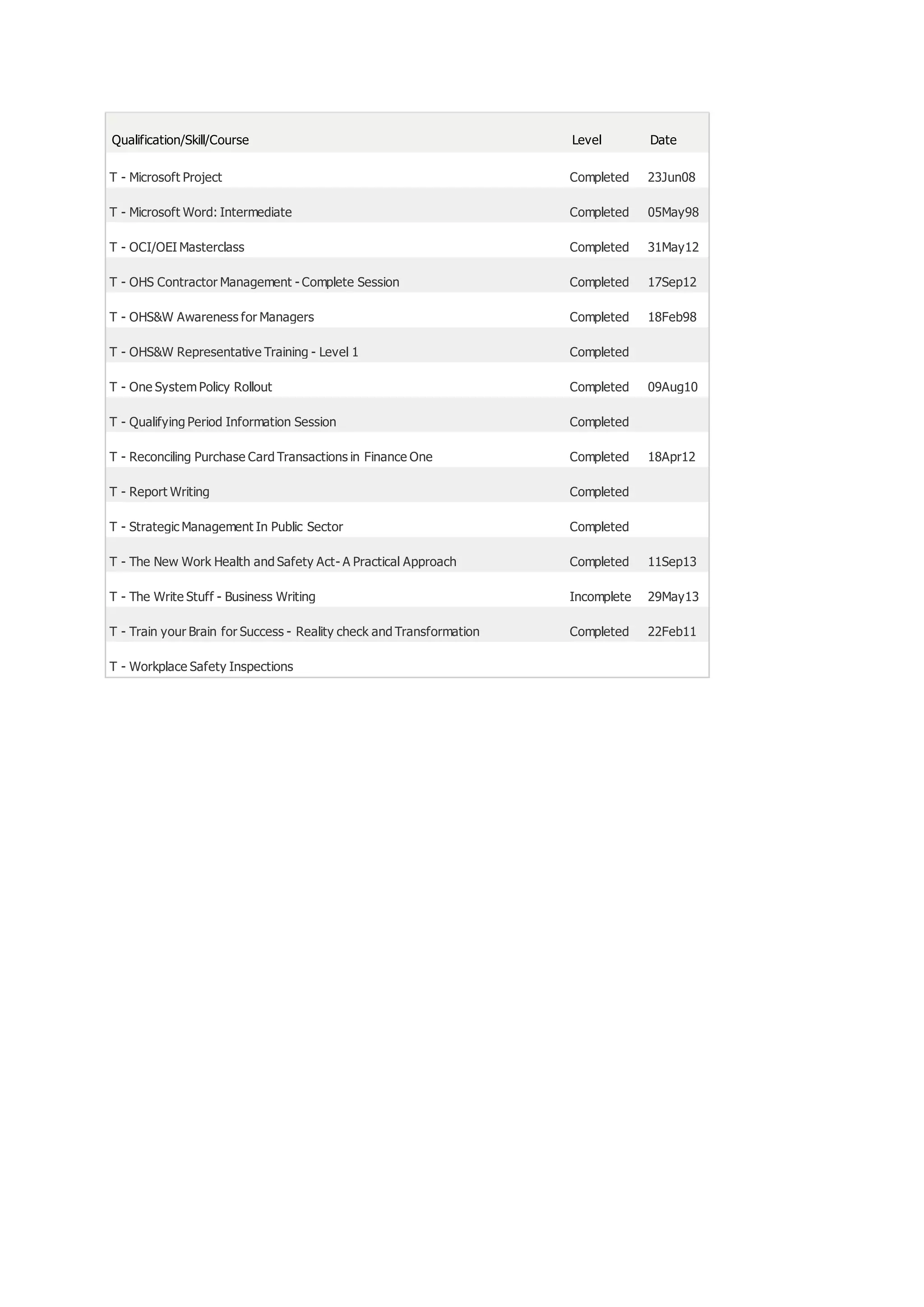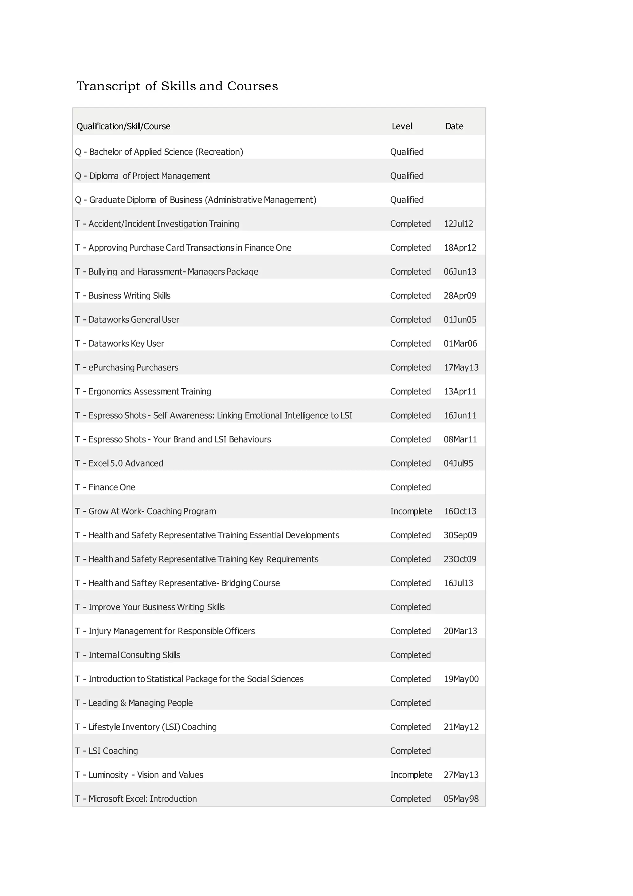 This document contains a list of qualifications, skills, and courses completed by an individual along with their level and date. It includes 3 bachelor's degrees, 3 diplomas, and over 30 training courses covering topics like accident investigation, purchasing, ergonomics, Microsoft programs, coaching, health and safety, injury management, statistics, leadership, and report writing. Dates for qualifications and trainings range from 1995 to 2013.