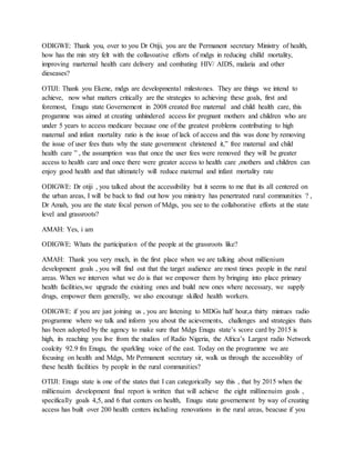 1) The document is a transcript of a radio program discussing Nigeria's efforts to achieve the Millennium Development Goals (MDGs) related to health in Enugu State.