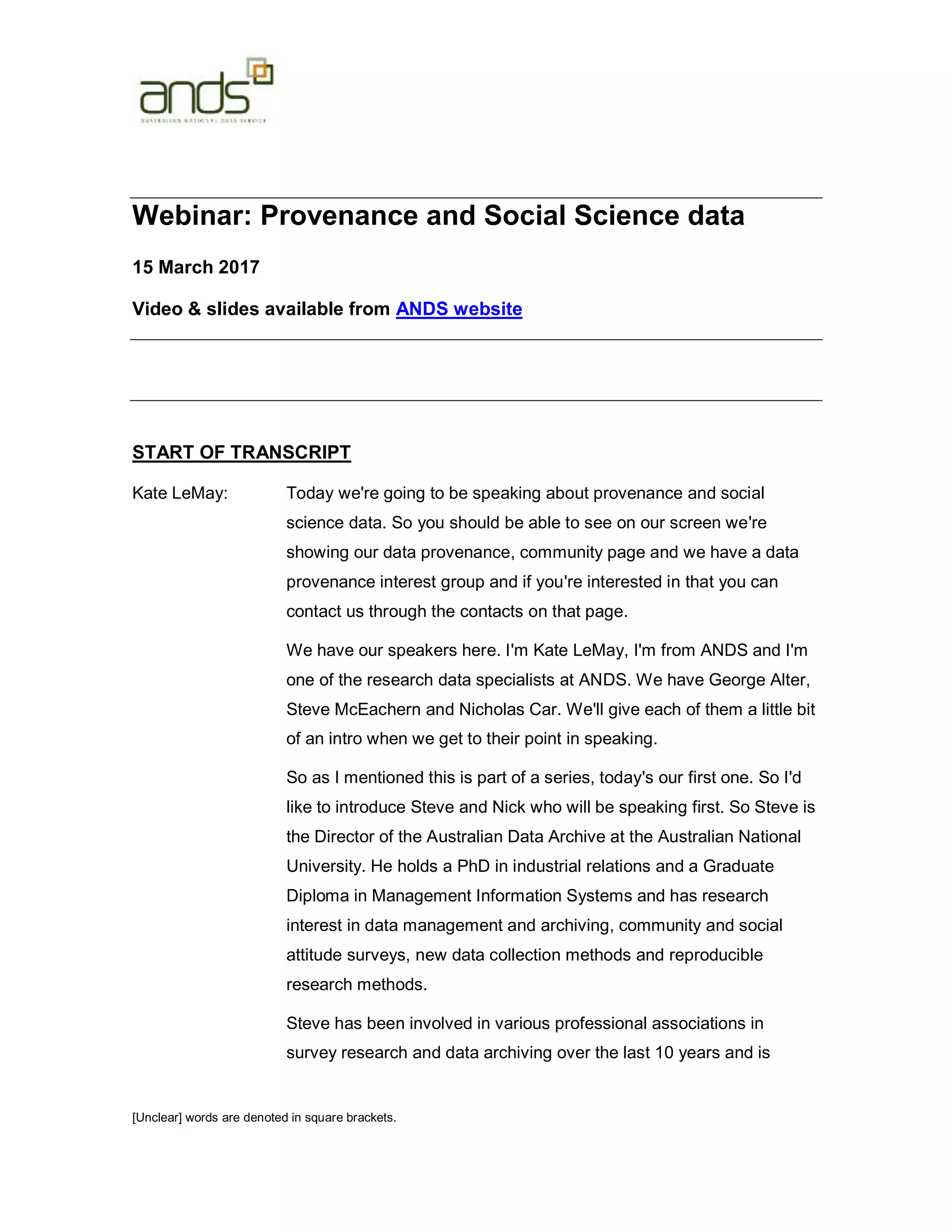The document is a transcript of a webinar discussing provenance and social science data, featuring speakers from the Australian National Data Service and the Australian Data Archive. It introduces the provenance standard 'prov', detailing its significance in data management, how it can be modeled, and its integration with other data systems. Additionally, it touches on the Data Documentation Initiative (DDI) standard and how it relates to the concept of provenance in social science research data.