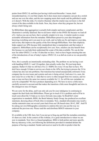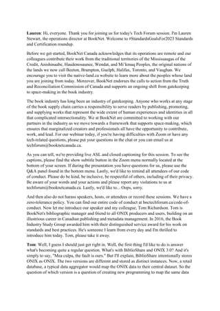 The webinar led by Lauren Stewart of BookNet Canada focuses on standards and certification in the book industry, particularly discussing the transition from ONIX 2.1 to ONIX 3.0, and the upcoming ONIX 3.1. Key topics include the importance of adhering to metadata standards and the challenges that arise during this transition, including the deprecation of certain data elements. Tom Richardson, the speaker, emphasizes the need for collaboration among data senders and retailers to improve metadata quality and facilitate smoother transitions between standard versions.