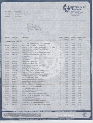 This document appears to be a transcript that lists various courses completed at a university, their course codes, titles, and final grades. It includes courses in learning strategies, popular American culture, written and oral communication, research skills, mathematics, biology, film studies, political processes, ethics, and classroom management. The grades range from A to D, with most being B or higher. The name of the university is written across the top of the transcript.