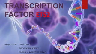 ETS2 is a transcription factor that regulates gene expression by interacting with other transcription factors. It is encoded by the ETS2 gene located on chromosome 21q22.2. ETS2 helps control differentiation in early embryonic development, including of the placenta and trophoblast cells. It is also involved in bone formation, lymphoid tissue development, and macrophage signaling. ETS2 functions as a proto-oncogene and regulates genes related to development, apoptosis, and telomerase regulation. It has roles in processes like cancer progression and is overexpressed in some cancers like prostate cancer.