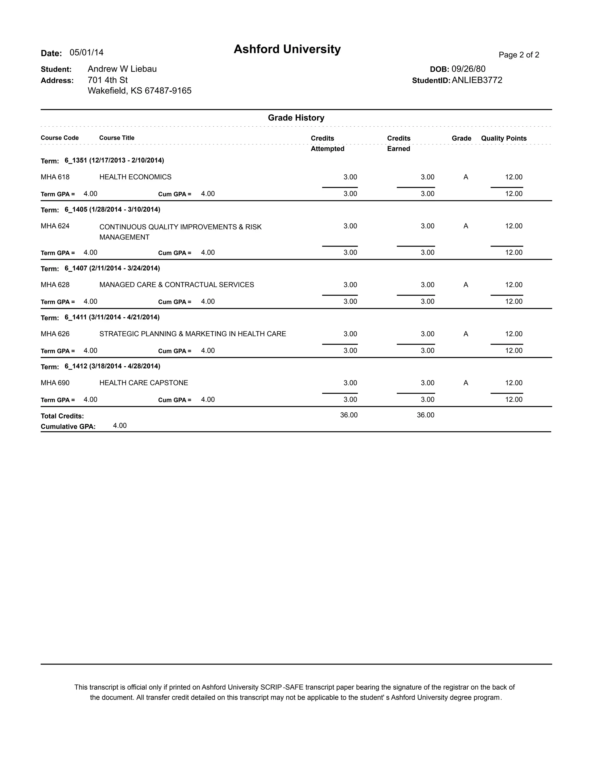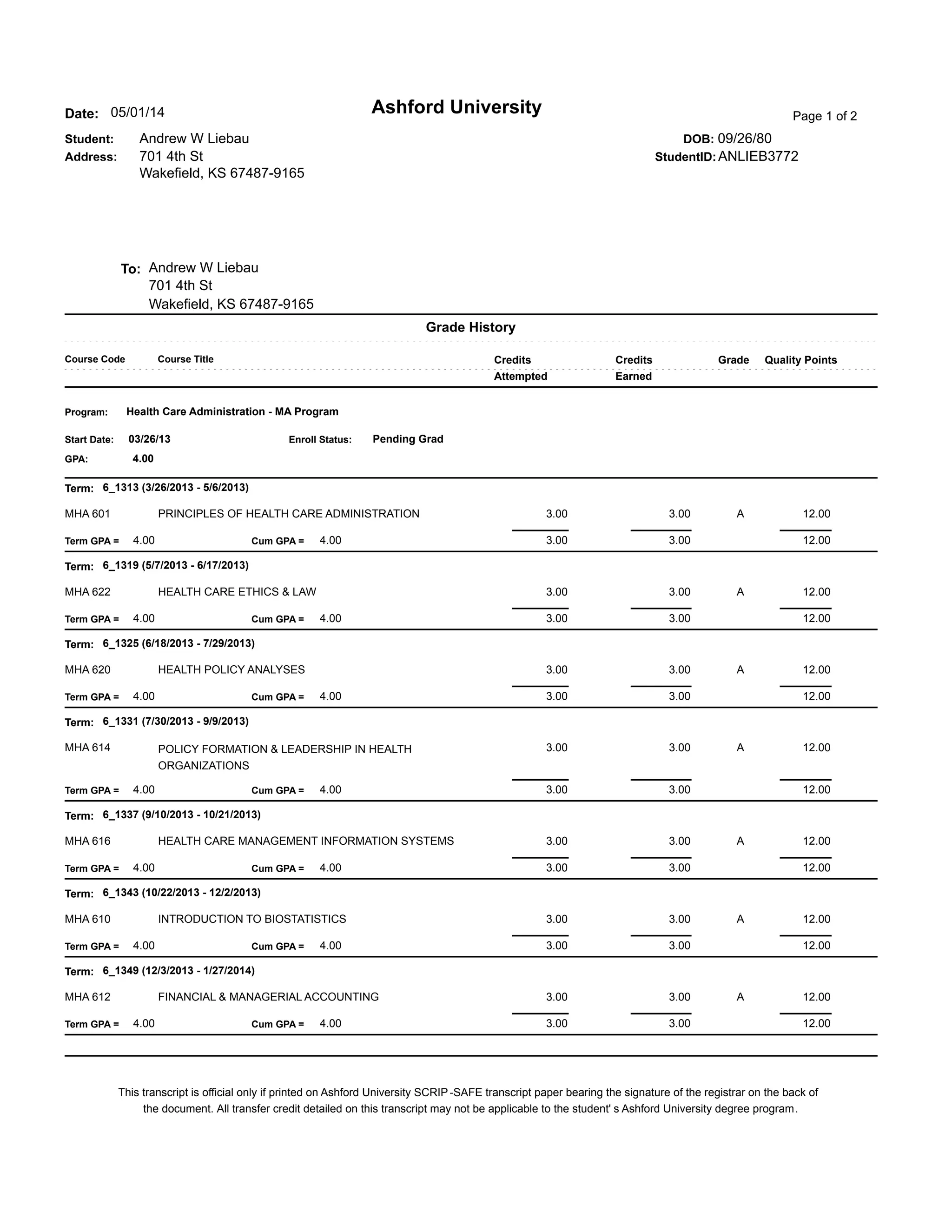 This transcript is for Andrew Liebau, enrolled in the Health Care Administration MA program at Ashford University. It shows that he has completed all required coursework with a cumulative GPA of 4.0. The courses include Principles of Health Care Administration, Health Care Ethics & Law, Health Policy Analyses, and others related to health administration. He has earned 36 credits total and has completed his degree program.