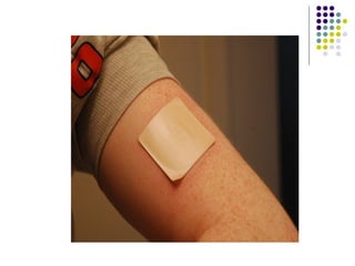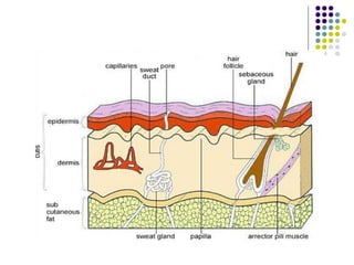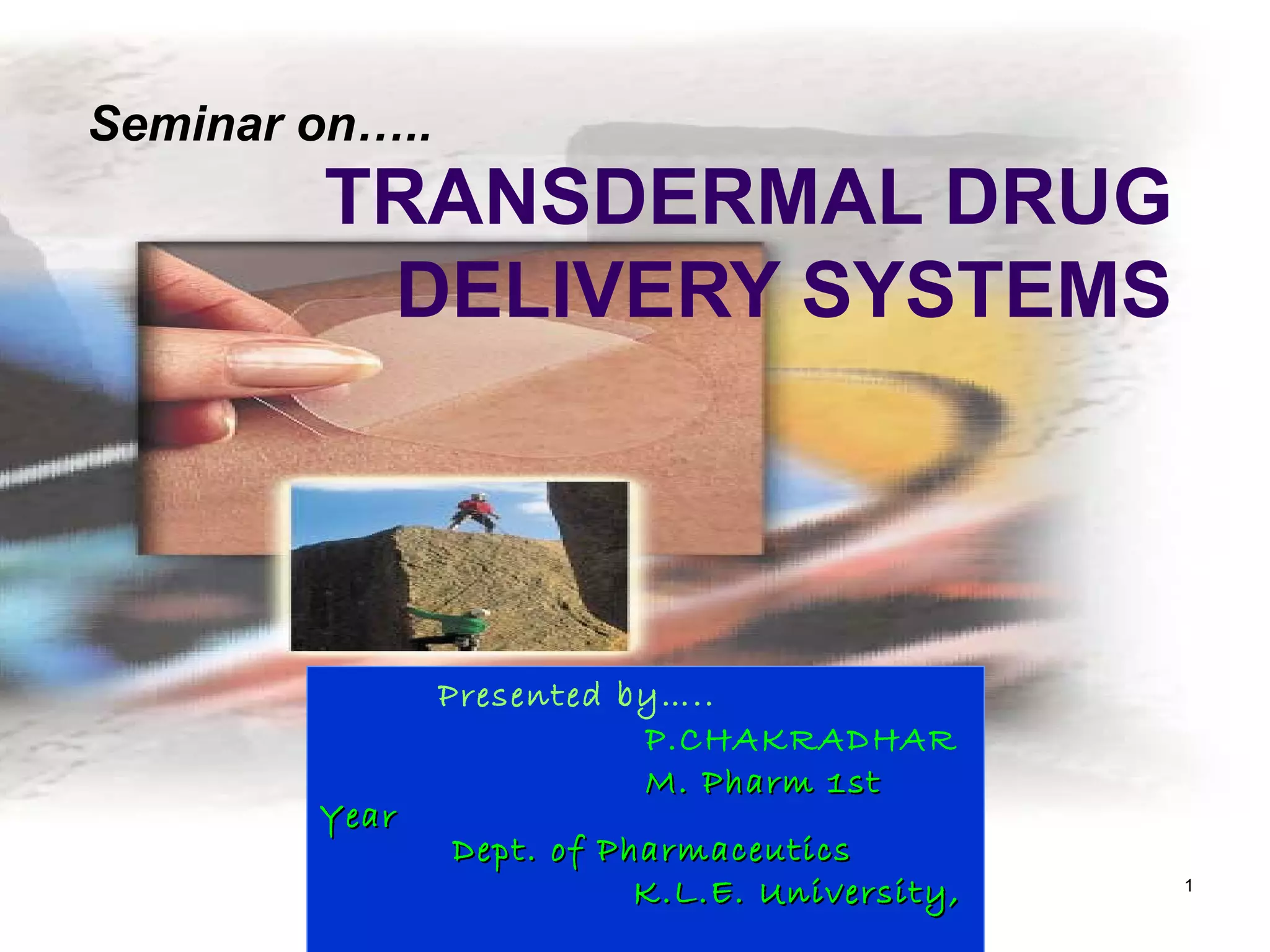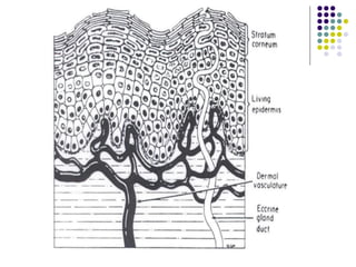 This document provides an overview of transdermal drug delivery systems. It defines transdermal therapeutic systems as self-contained dosage forms that deliver drugs through the skin at a controlled rate. The document outlines the contents to be covered, which include the advantages and structure of the skin, permeation through skin, and formulation and evaluation of transdermal drug delivery systems. It also briefly discusses the history and factors affecting permeation through skin.