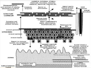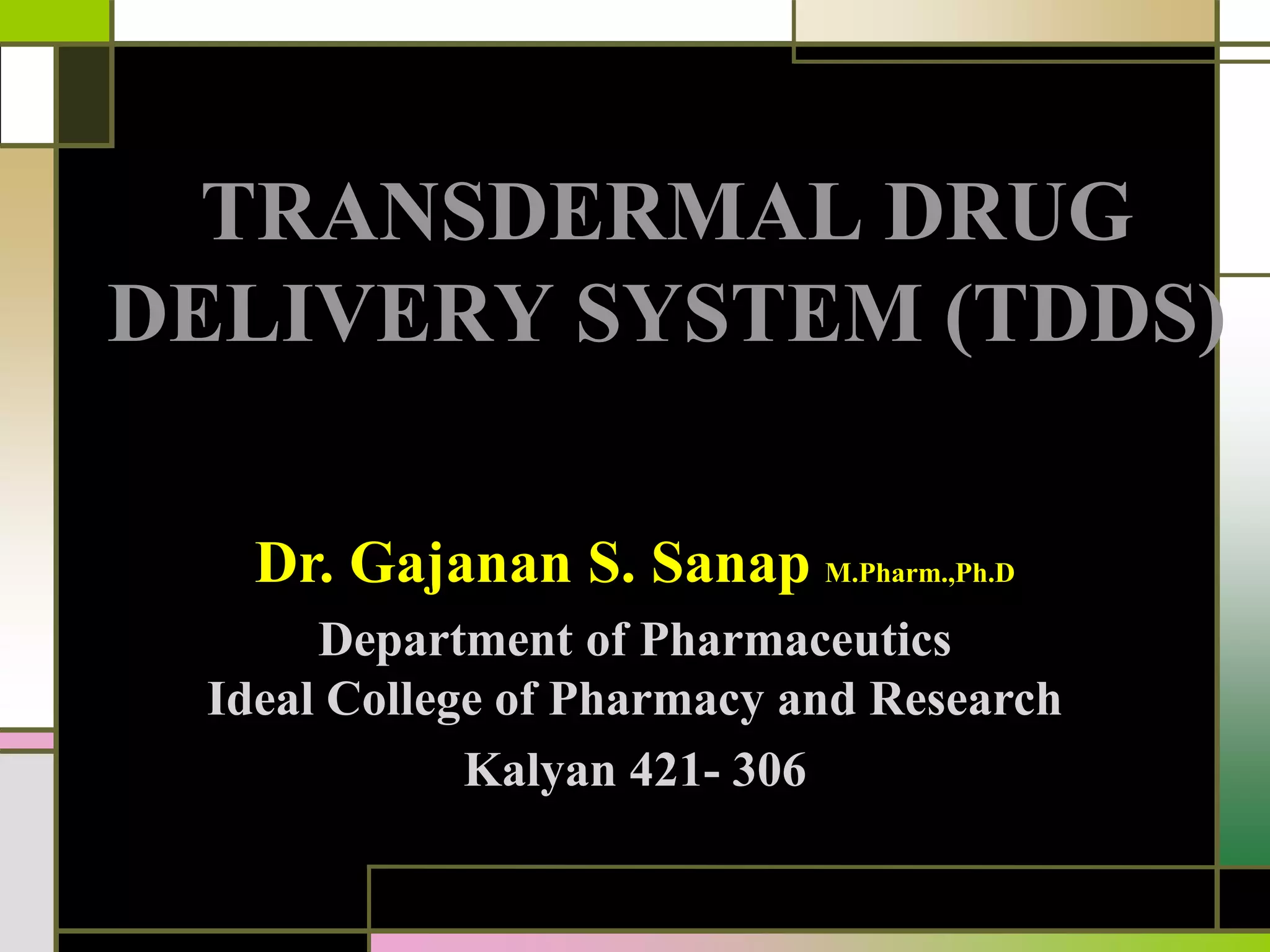 The document discusses transdermal drug delivery systems (TDDS). It defines TDDS and provides their advantages over other drug delivery methods. It describes the skin structure, especially the stratum corneum layer, and how drugs penetrate the skin through various routes. Factors that affect transdermal drug permeability are outlined. Ideal drug candidates and components of TDDS like polymers and permeation enhancers are also discussed.