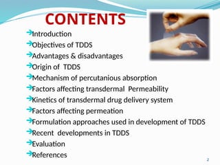 The document provides a comprehensive overview of transdermal drug delivery systems (TDDS), detailing their definition, history, advantages, and disadvantages. It discusses the mechanisms of drug absorption through the skin, factors affecting transdermal permeability, the components involved in TDDS formulation, and examples of successful transdermal patches. Additionally, it covers the technological approaches for developing TDDS, emphasizing the need for careful selection of drugs and polymers to ensure effective and safe delivery.