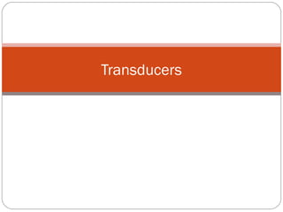 This document discusses transducers and their classification. It defines a transducer as a device that converts one form of energy or information to another. Transducers are classified as mechanical, electrical, active, passive, analog, and digital. The key requirements of transducers are also summarized, including linearity, repeatability, reliability, and environmental withstand. Selection of the proper transducer depends on factors like the range, sensitivity, output characteristics, and operating environment of the application.