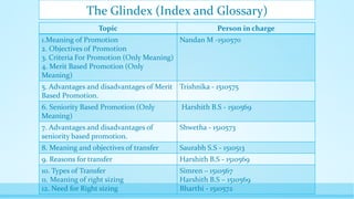 The document discusses the importance of promotion and transfer in corporate success, detailing the meanings, objectives, and criteria for both merit and seniority-based promotions. It highlights the advantages and disadvantages of each promotion method, as well as the reasons and purposes for employee transfers. Additionally, it covers the concept of right-sizing in workforce management, aiming for an optimal number of employees with the necessary skills.