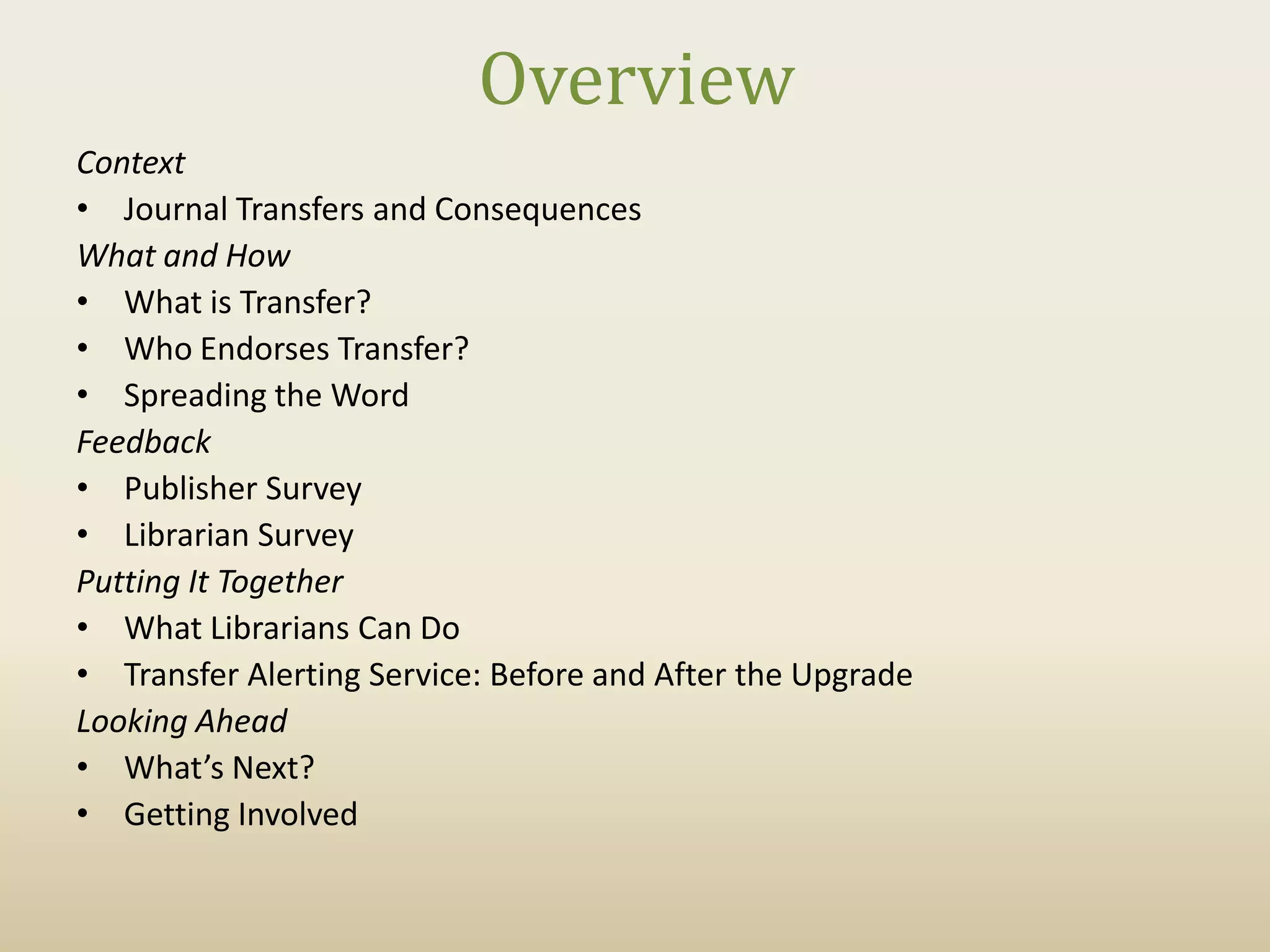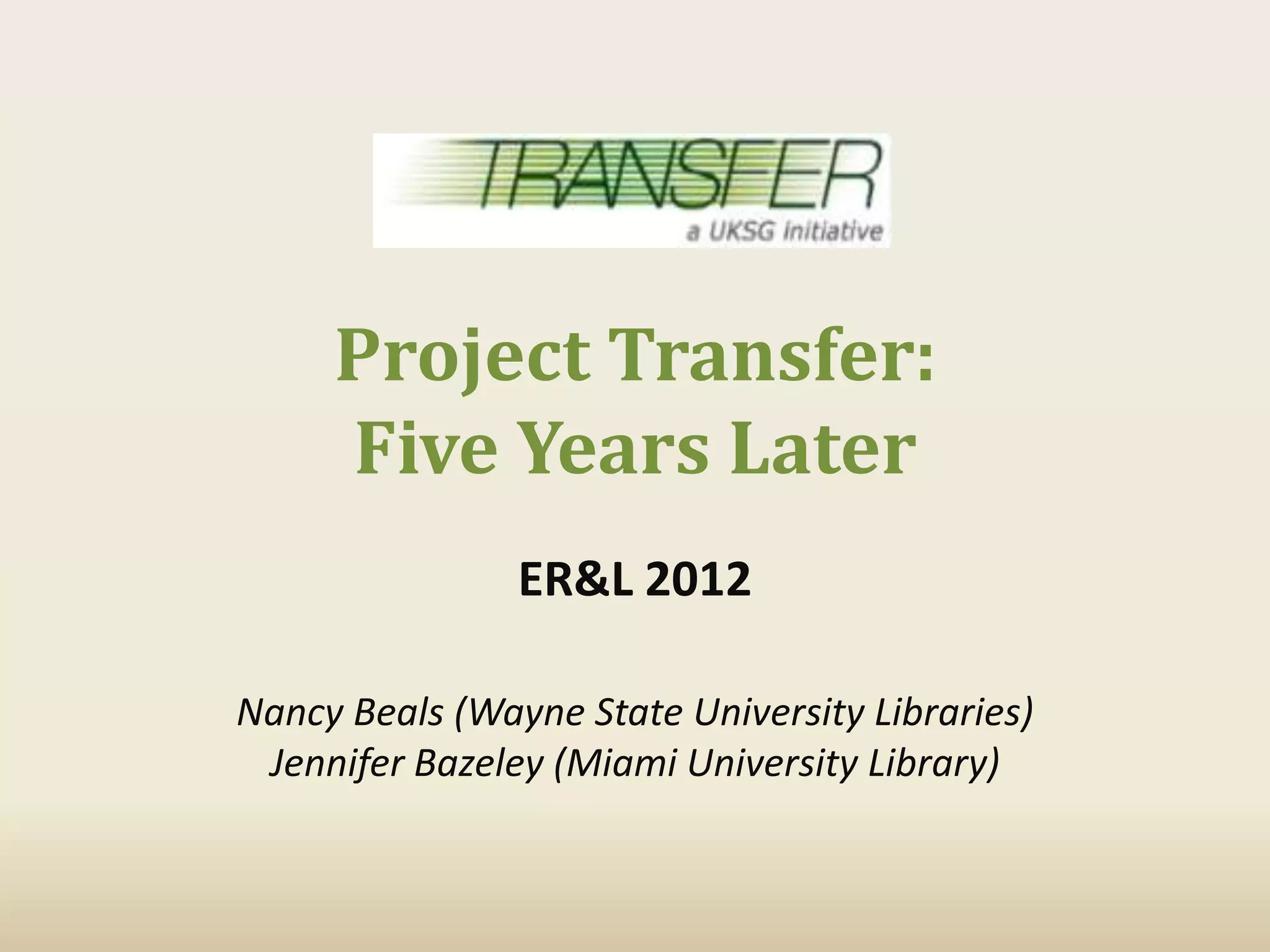Project Transfer is a voluntary code of practice endorsed by 36 publishers to provide best practices for transferring journals between publishers. It aims to minimize disruptions to access during transfers. An alerting service notifies subscribers like librarians about upcoming transfers. The service was recently upgraded to be more robust and searchable. Surveys found publishers and librarians still encounter issues during some transfers. Future work may expand the code of practice and increase its formality. Participation and awareness of Transfer remains important.