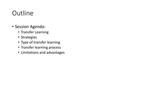 This document discusses transfer learning for deep learning applications. Transfer learning is the idea of utilizing knowledge gained from one task to help solve another related task. It can help overcome isolated learning and move towards artificial general intelligence. There are different strategies for transfer learning including inductive, unsupervised, and transductive transfer learning. Deep transfer learning techniques include fine-tuning pre-trained models on new tasks and domains. Transfer learning provides advantages such as helping solve complex problems with limited labeled data and making AI systems more generally applicable. However, challenges include avoiding negative transfer between domains and understanding transfer bounds.