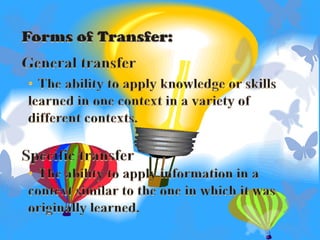 This document discusses the concept of transfer of learning. Transfer of learning refers to applying knowledge or skills learned in one context to a new context. There are different types of transfer, including low-road transfer which involves automatic application of well-practiced skills, and high-road transfer which involves consciously applying abstract knowledge. Factors like similarity between contexts, depth of understanding, and emphasis on metacognition can affect how well transfer occurs. The document also discusses common misconceptions about transfer and provides suggestions for teaching to promote students' ability to transfer knowledge.
