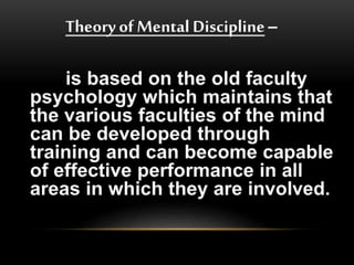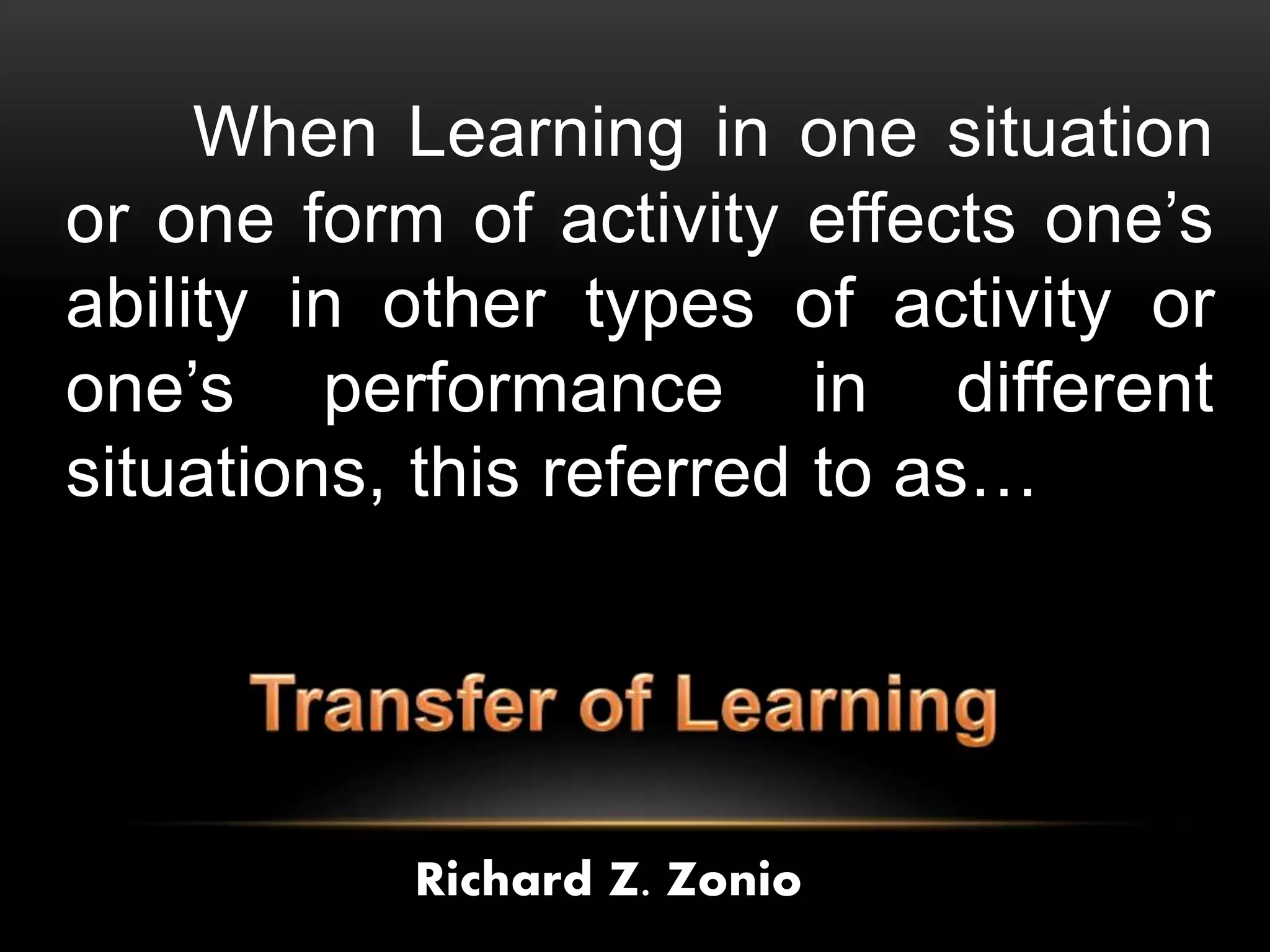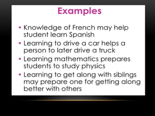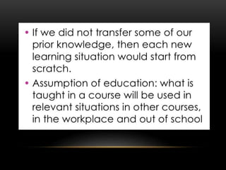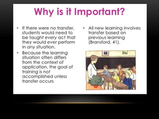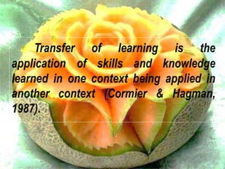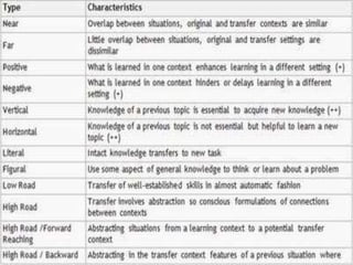 This document discusses several theories of transfer of learning, which refers to how learning one skill or concept affects performance in other areas. The main theories covered are the theory of mental discipline, identical elements theory, theory of generalization, and theory of configuration. The identical elements theory, proposed by Thorndike, states that transfer depends on the common elements between situations. Near and far transfer are also discussed, referring to applying skills in similar versus changing situations. Factors like learner ability, subject matter, attitudes, teaching methods, and environment can impact transfer. Modern perspectives view transfer through a metacognitive lens, focusing on learning how to learn and making connections between past and present learning.