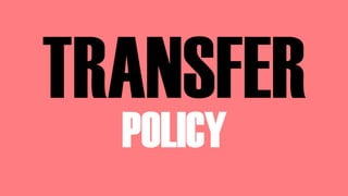 This document outlines an organization's transfer and relocation policies. It defines a transfer as a lateral move, promotion, department change, or job change within the organization. Transfers can occur due to performance, behavior, promotion, or changing from a temporary to permanent position. The policy provides details on allowances for temporary accommodation, travel reimbursement, and a transfer allowance of Rs. 50,000 for relocating between two specified locations. Travel entitlements on transfer follow the same guidelines as for tours, and small family norms apply.