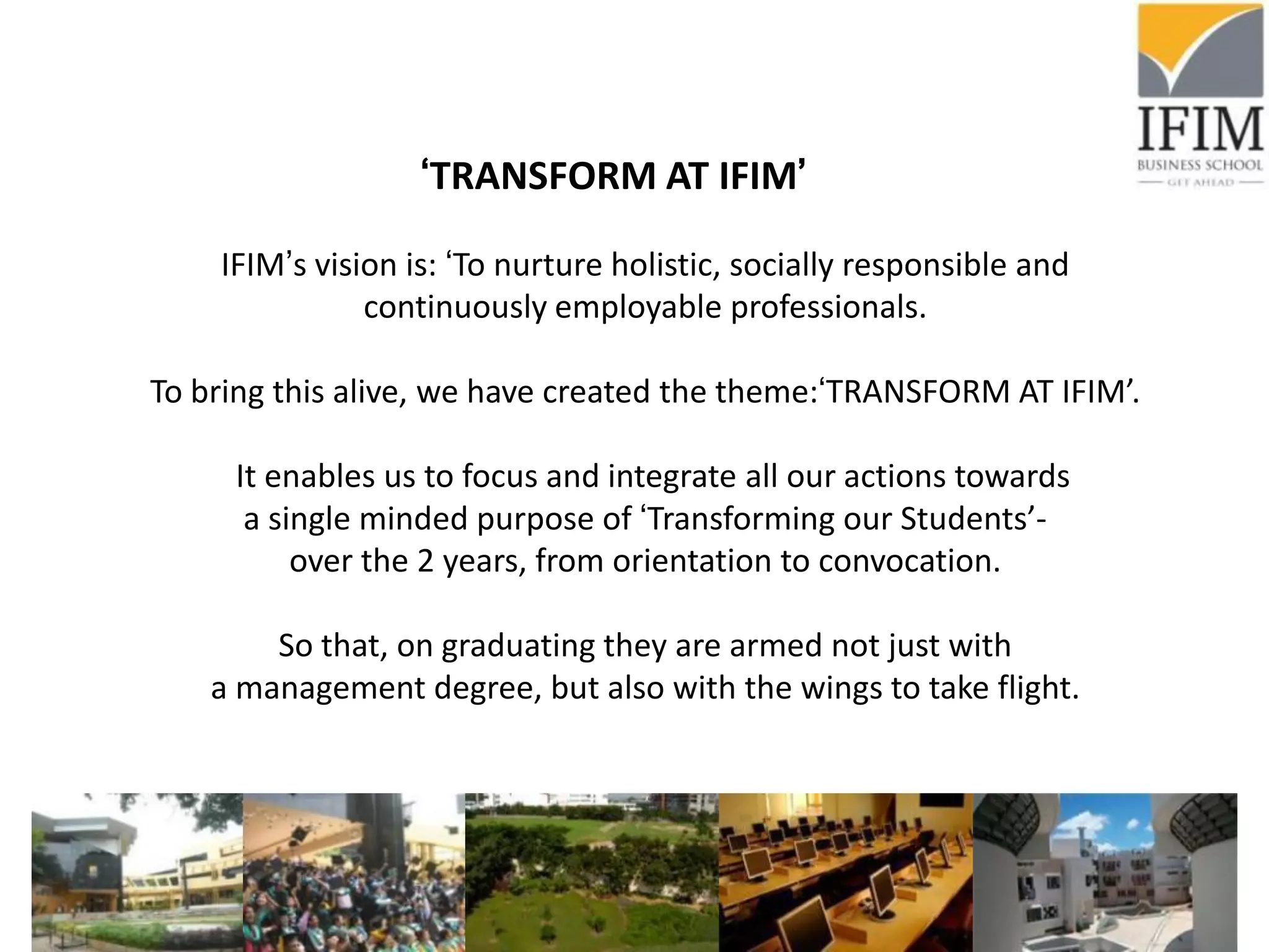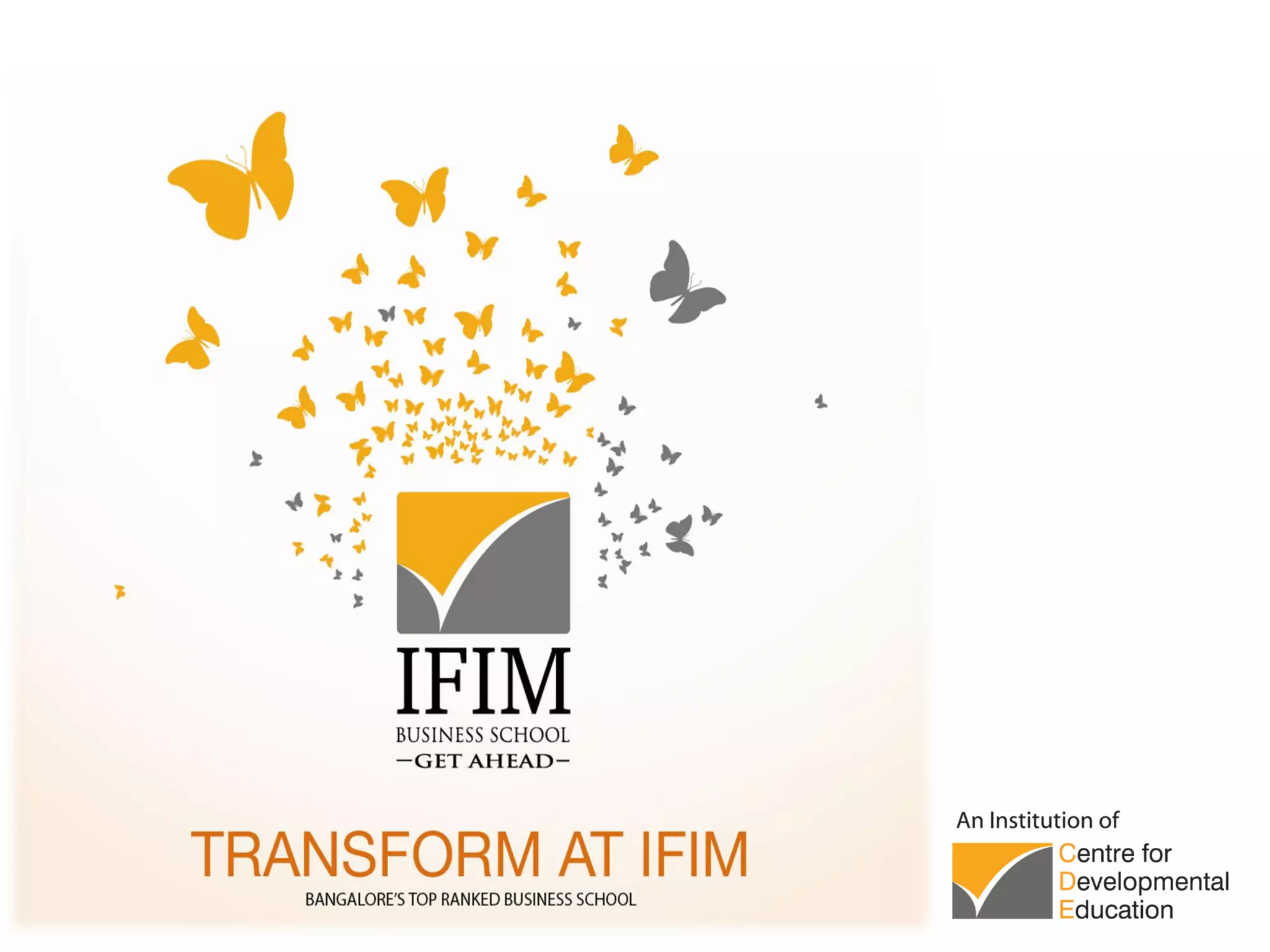 IFIM is a 19-year-old autonomous business school located in Bangalore that aims to transform its students over two years of study into holistic and employable professionals. It has various full-time and part-time management programs, and is consistently ranked among the top 40 B-schools in India. IFIM places emphasis on industry-institute engagement and international partnerships to provide students with real-world experience.