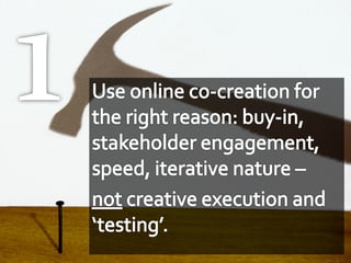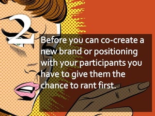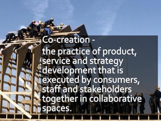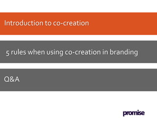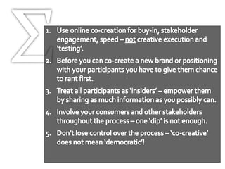 The document discusses the importance of co-creation in branding, highlighting how companies like Kraft and Diageo engage consumers in the branding process. It outlines key rules for effective co-creation and shares insights from industry experts about the benefits of community involvement, such as increased buy-in and reduced risks. Real-world examples, including Kraft’s collaboration with employees and consumers, showcase the impact of collaborative branding efforts.