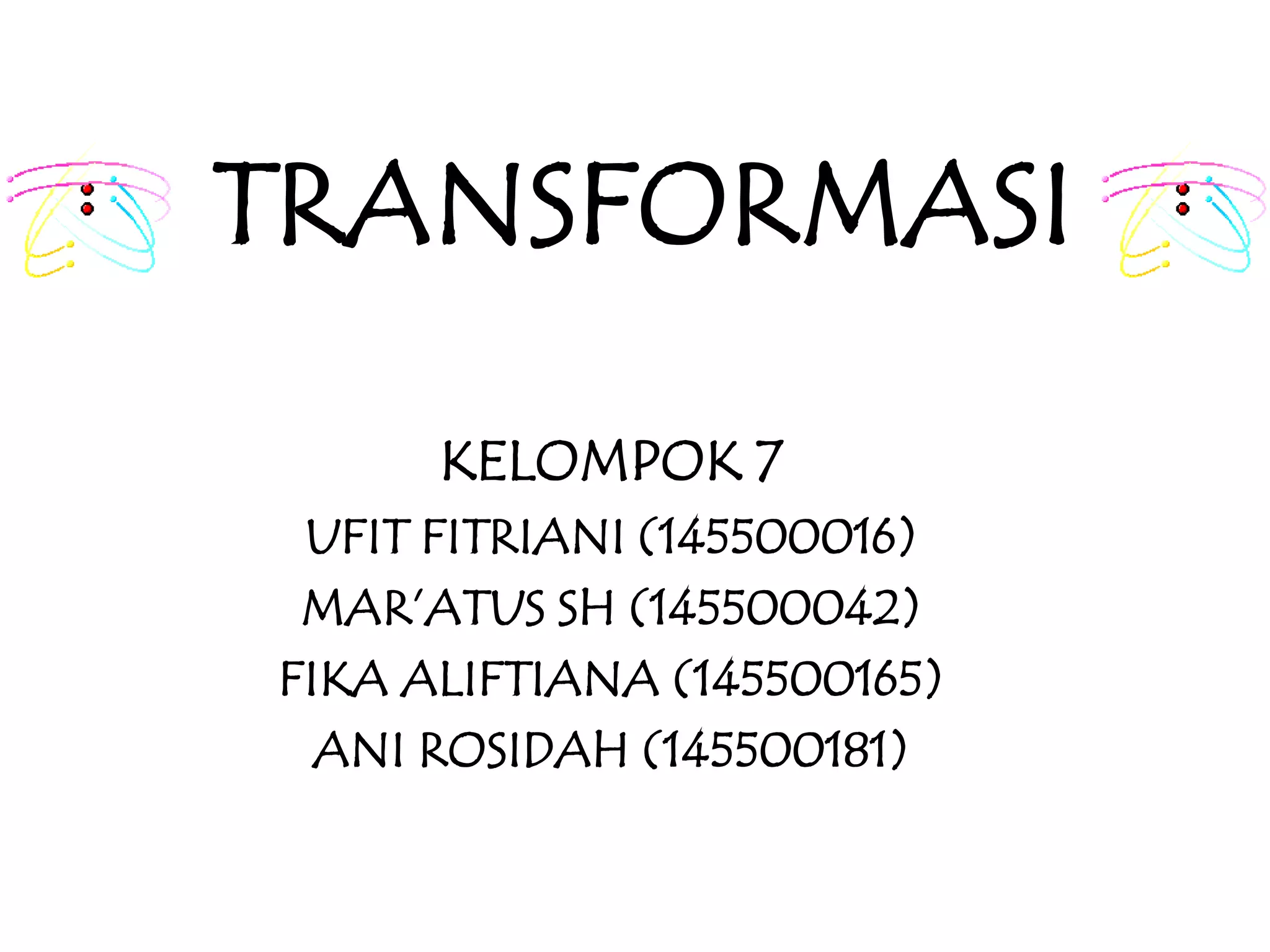 1. Dokumen menjelaskan berbagai jenis transformasi geometri dua dimensi seperti translasi, refleksi, rotasi, dan dilatasi.