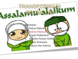 Dokumen ini membahas tentang berbagai jenis transformasi dalam matematika, mencakup translasi, refleksi, rotasi, dan dilatasi, beserta rumus matris dan karakteristiknya. Selain itu, dijelaskan juga komposisi transformasi dan pengaruhnya terhadap perubahan titik dan luas bangun. Kesimpulannya, komposisi transformasi dapat menghasilkan variasi yang kompleks tergantung pada jenis transformasi yang diterapkan.