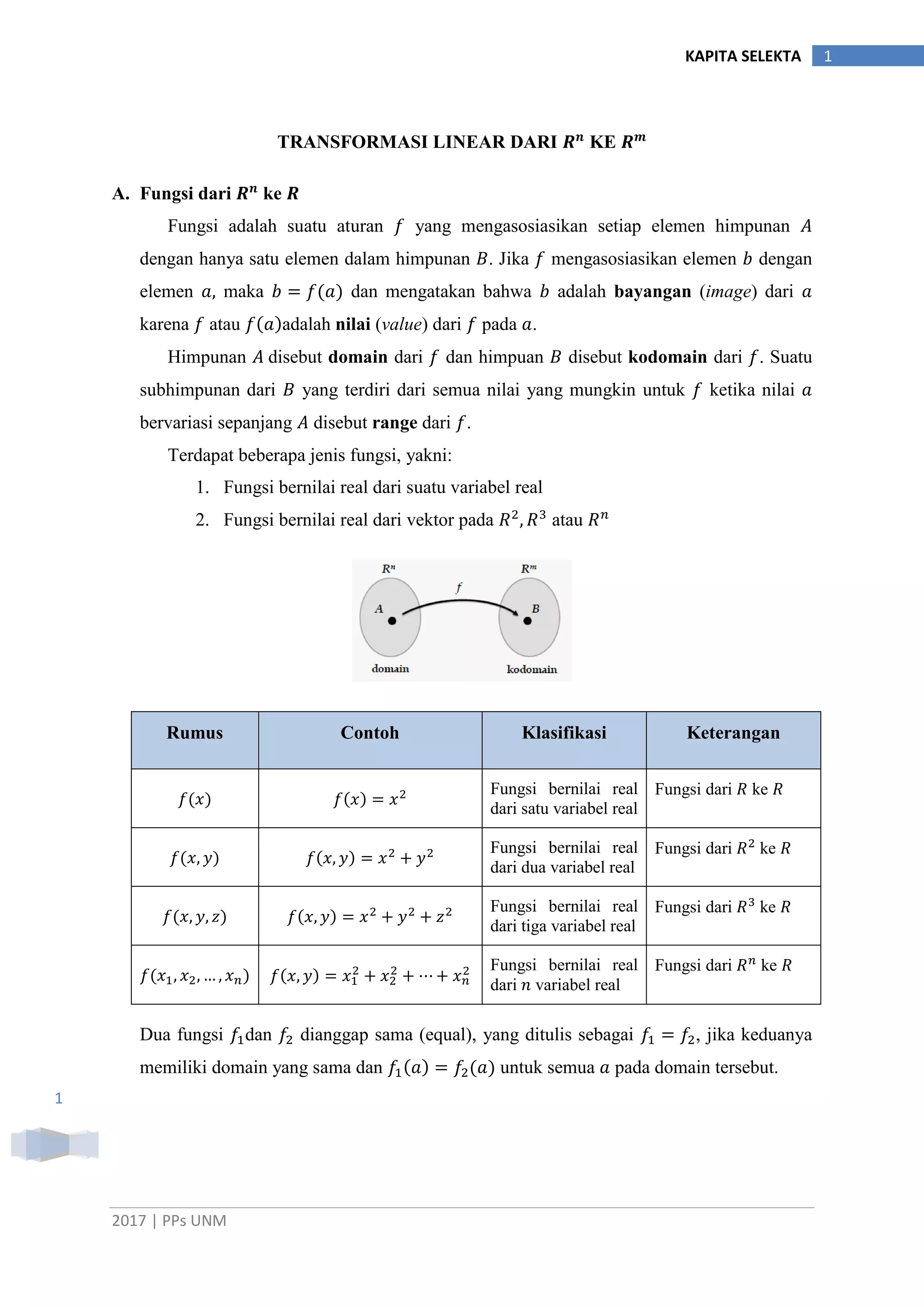 Dokumen tersebut membahas tentang transformasi linear dari satu himpunan ke himpunan lain. Secara singkat, dibahas mengenai definisi fungsi dan transformasi linear, jenis-jenis transformasi linear seperti rotasi, refleksi, ekspansi, dan komposisi dari beberapa transformasi linear. Representasi geometris dan matriks standar dari berbagai transformasi linear pun dijelaskan.
