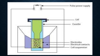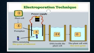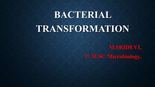 The document provides information about bacterial transformation. It describes that transformation is the process by which bacteria take up extracellular DNA from their environment. Frederick Griffith first discovered transformation in 1928 while working with pneumococcus bacteria. His experiments showed that a non-virulent rough form could be transformed into a virulent smooth form by DNA from a heat-killed smooth strain. Later experiments by Avery, Macleod and McCarty demonstrated that DNA is the transforming principle and genetic material of bacteria. The document then discusses various methods of bacterial transformation including chemical and physical methods like electroporation and use of calcium chloride. It also explains the molecular mechanism of transformation involving DNA binding, penetration, synapsis formation and integration into the bacterial chromosome.