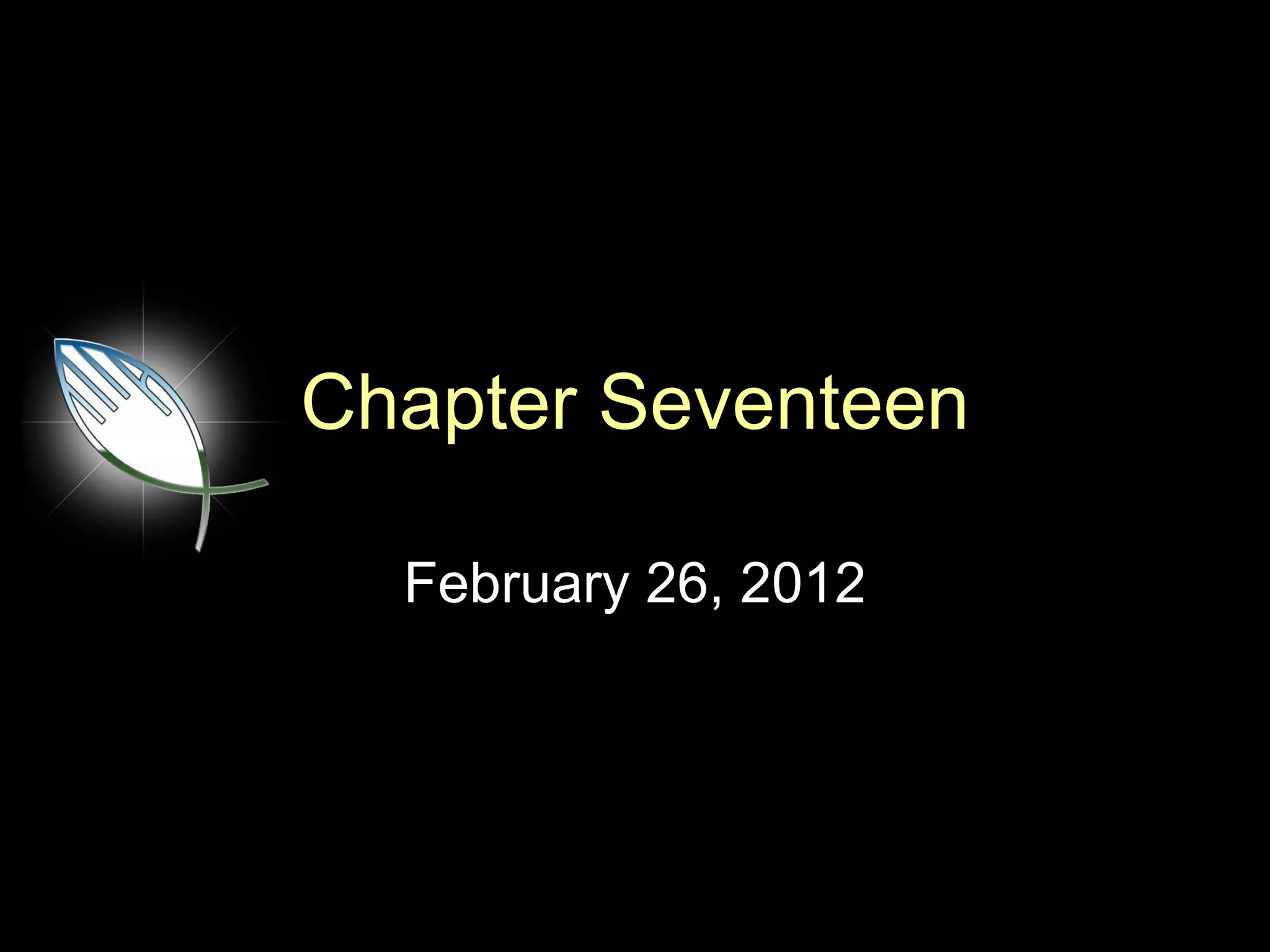 Chapter 17 introduces the great harlot who sits on many waters. She is described as wearing purple, scarlet, gold and carrying a golden cup of abominations. The angel explains she represents the great city that rules over the earth. She sits on a scarlet beast with seven heads and ten horns. The beast and the ten horns will turn against the harlot and destroy her, as God's judgment is fulfilled.
