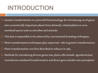 This document discusses new techniques for improving crop productivity through plant-bacterium gene manipulation. It describes various methods for transforming plant cells, including Agrobacterium-mediated transformation, microprojectile bombardment, electroporation, microinjection, vacuum infiltration, and others. Agrobacterium-mediated transformation is highlighted as one of the most efficient and widely used methods, with transformation efficiencies as high as 90% achieved in some crops. The document provides details on the mechanisms, applications, and improvements of different transformation techniques.