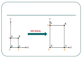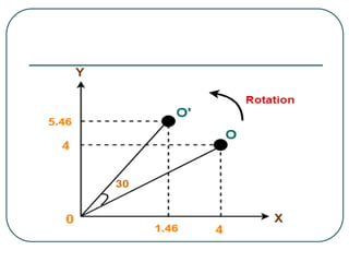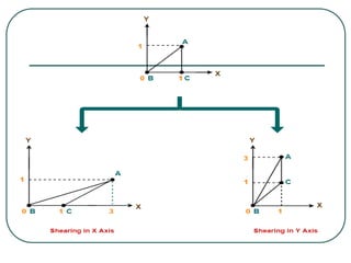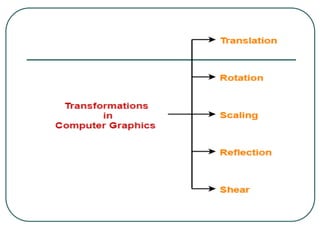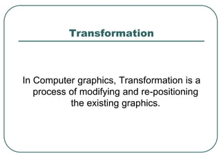 Geometric transformations play an important role in computer graphics by allowing graphics to be repositioned on the screen or changed in size and orientation. There are several types of 2D transformations including translation, rotation, scaling, reflection, and shearing. Translation moves an object by translating each vertex by a certain distance. Rotation moves a point around a center point by a certain angle. Scaling enlarges or shrinks an object by a scaling factor. Reflection produces a mirror image of an object across an axis. Shearing distorts an object by shifting coordinate values.