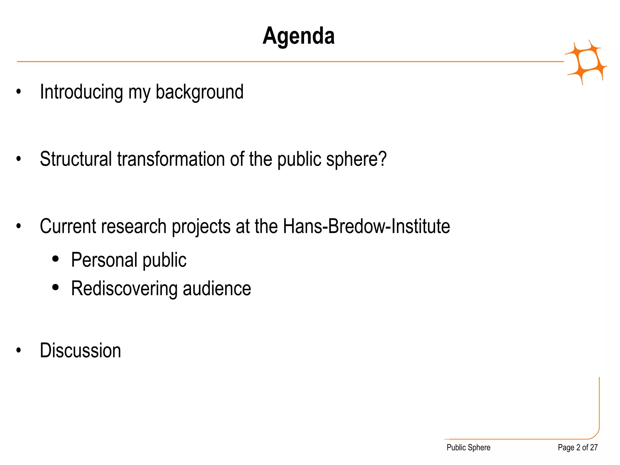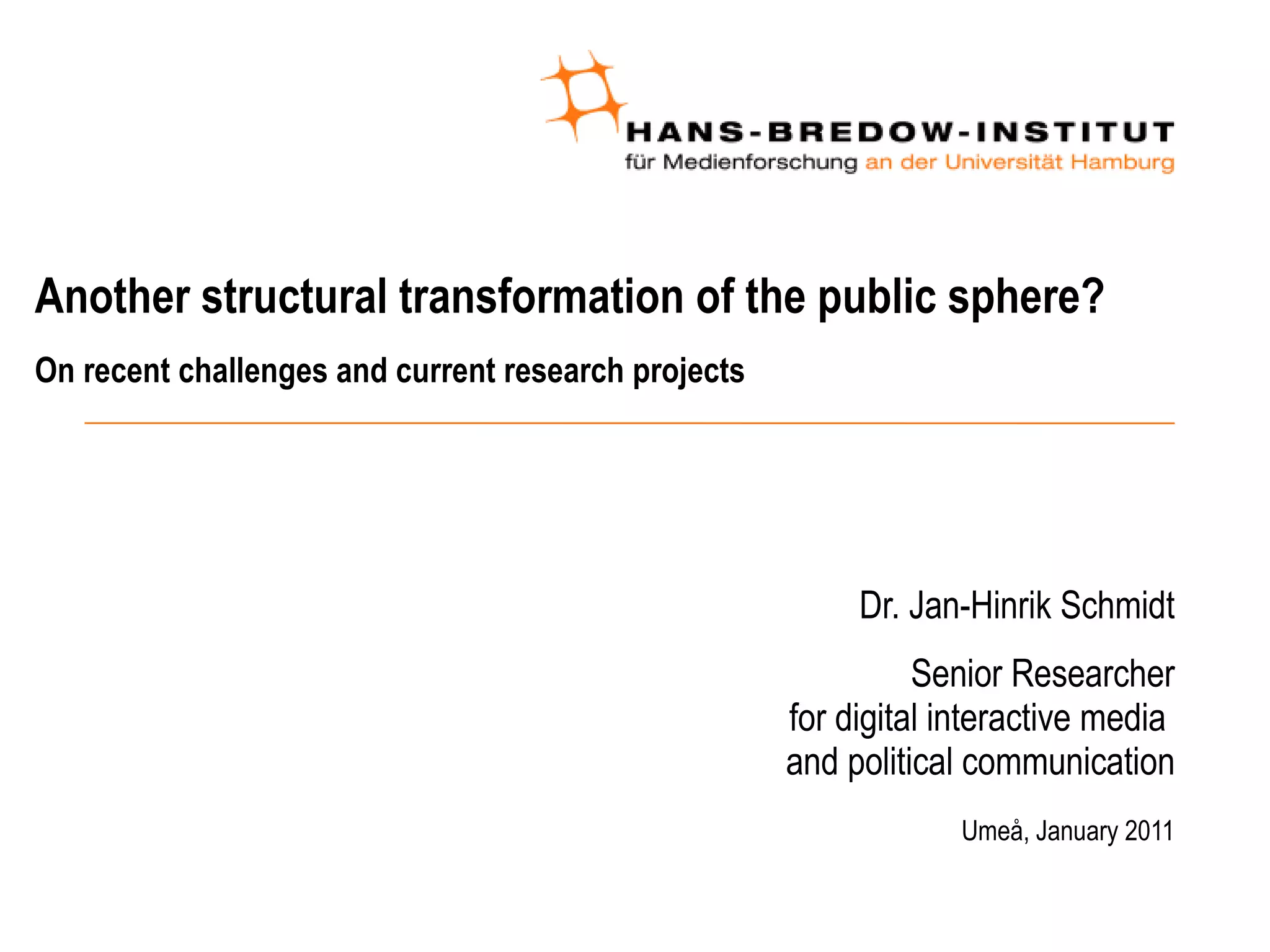 The document discusses the structural transformation of the public sphere influenced by technological convergence, globalization, and social networked individualism. It highlights research at the Hans-Bredow Institute focusing on changing roles of audiences, the interplay between professional and participatory media, and the emergence of personal publics. Additionally, it critiques journalism's ability to include audiences in the digital age, emphasizing the need for new concepts and theories to understand evolving public spheres.