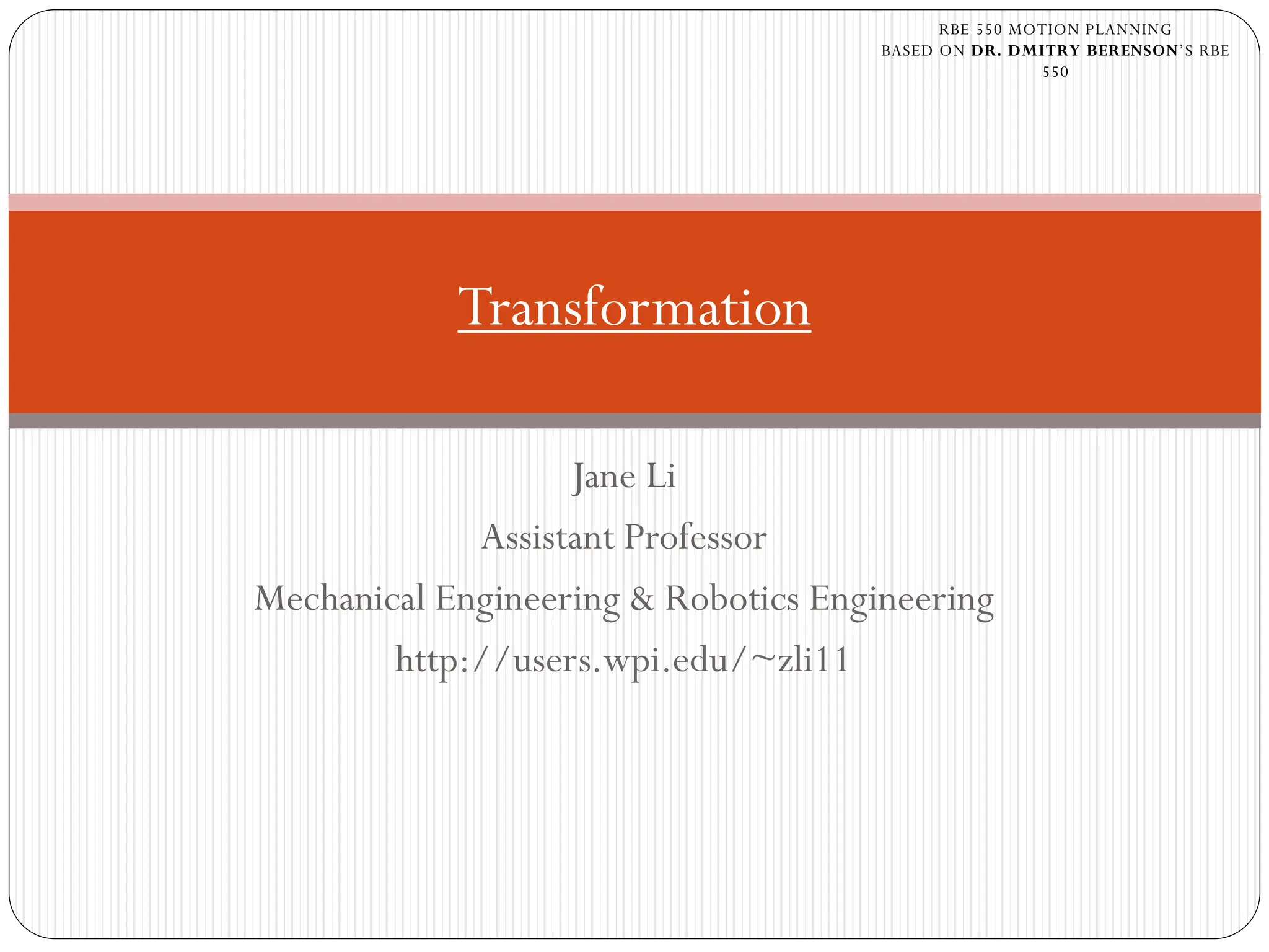 The document discusses motion planning in robotics, focusing on rigid-body transformations and their various representations, including Euler angles, homogeneous transformations, and quaternions. It emphasizes the importance of understanding rotations and translations in both fixed and moving frames, and highlights the limitations such as gimbal lock. Different transformation techniques are compared for their efficiency and applicability in motion planning contexts.
