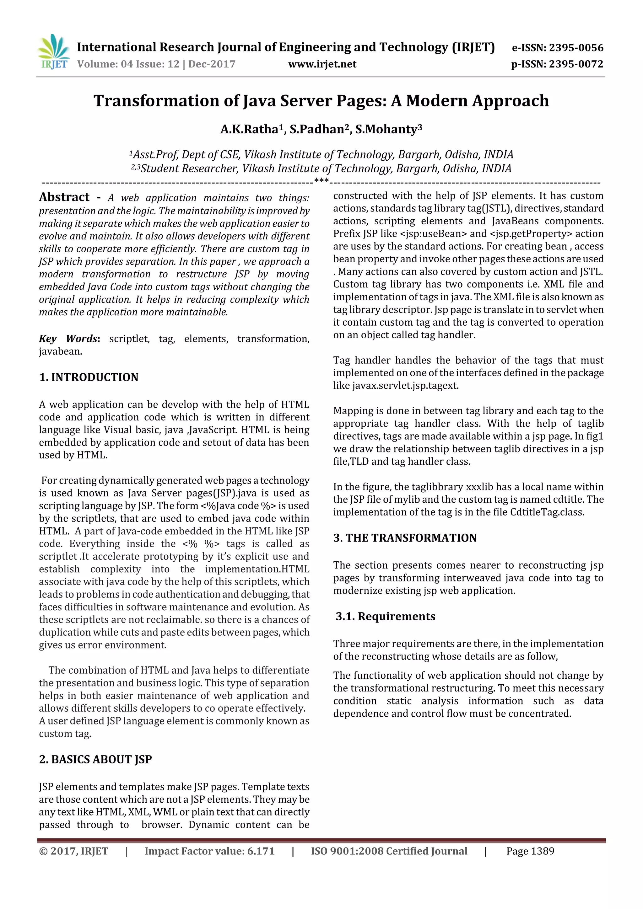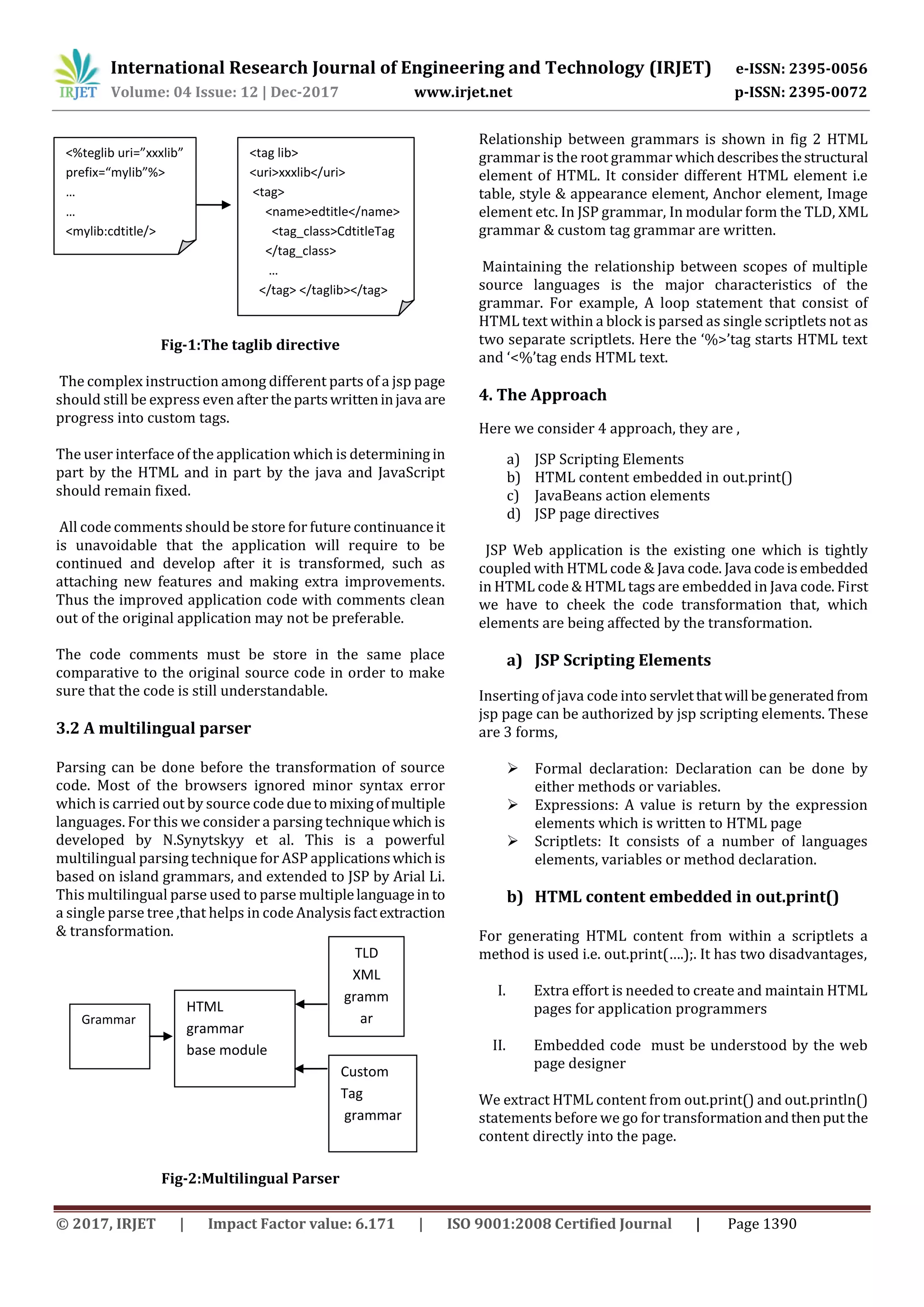 This document discusses transforming Java code embedded in Java Server Pages (JSP) into custom tags to improve maintainability. It proposes a multi-language parser to parse JSP pages containing HTML and Java code. It then describes four approaches to transforming JSP scripting elements, HTML embedded in print statements, JavaBeans actions, and page directives. Finally, it outlines a general transformation strategy involving four cases: a single custom tag, nested tags, tags depending on conditional logic, and multiple custom tags. The goal is to move Java code out of JSP into custom tags while preserving functionality and comments to aid future maintenance.