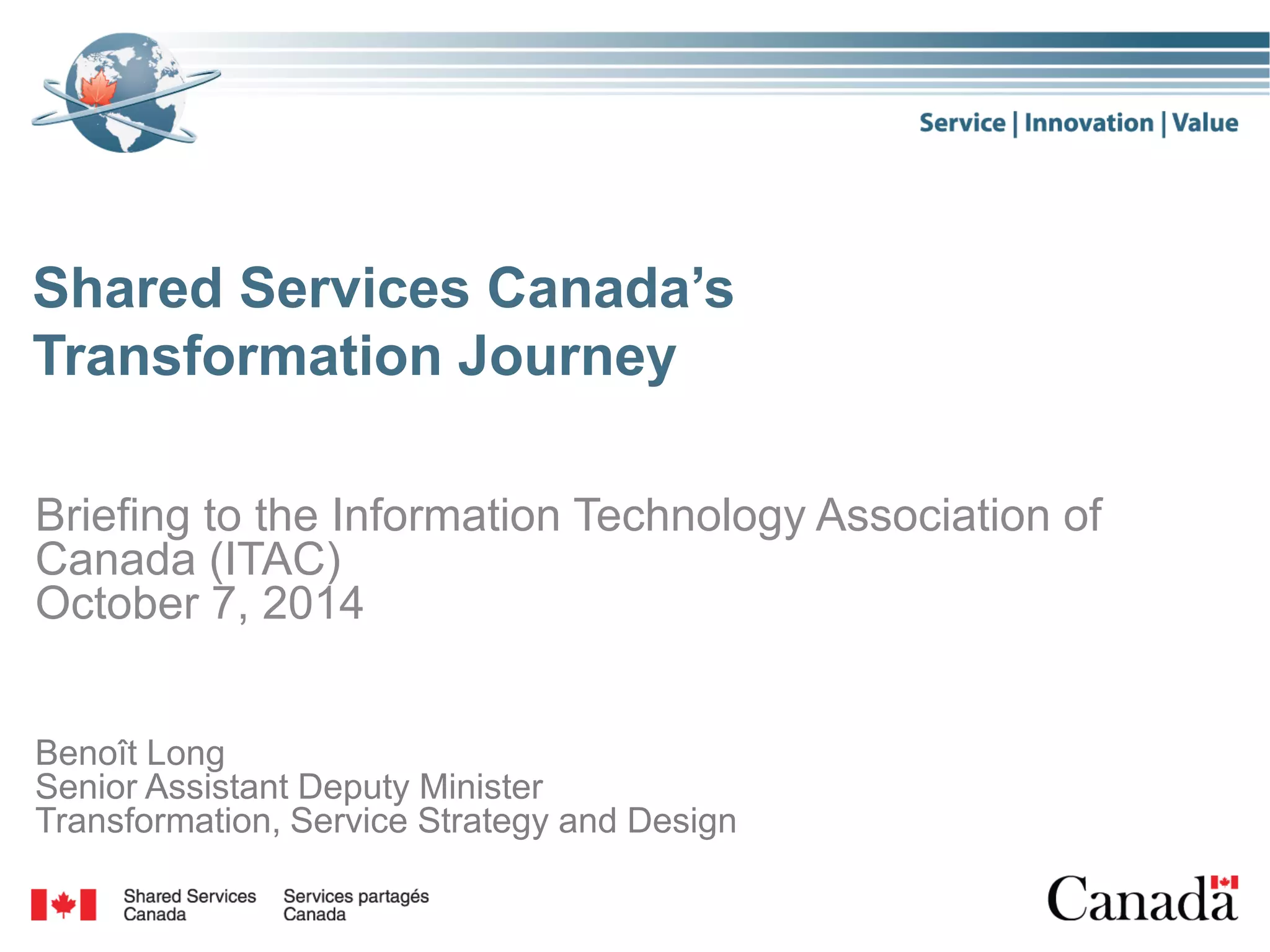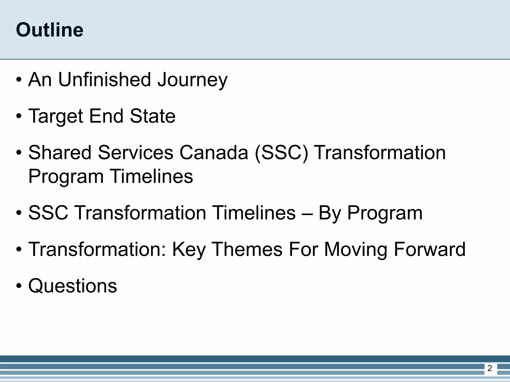 Shared Services Canada's transformation aims to streamline IT infrastructure across the Canadian government. Key elements include consolidating data centers, networks, and security services. The transformation is an ongoing process with milestones over several years, including establishing additional data centers, migrating departments to shared telecom and workplace services, and improving cybersecurity capabilities through releases of a new Security Operations Centre. Maintaining focus on the transformation plan and ensuring all necessary capabilities are in place will be important for successful implementation.
