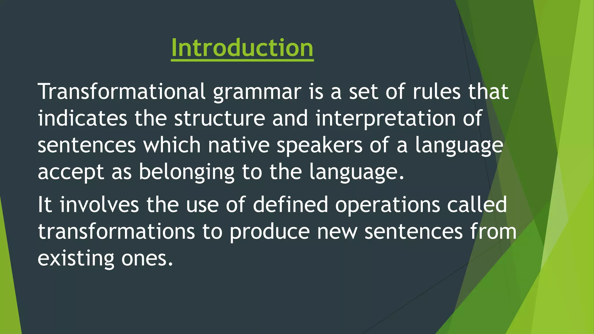 This document discusses Transformational Generative Grammar as proposed by Noam Chomsky. It defines a sentence as being "well formed" if native speakers accept it as grammatically correct. A language consists of a set of well formed sentences. Transformational grammar uses defined "transformations" like insertion, deletion, movement, and substitution to generate new sentences from existing ones. It has both a "transformational" aspect, allowing sentences to be changed while keeping or changing meaning, and a "generative" aspect, allowing an infinite number of sentences to be produced from a finite set of rules. Sentences have both a "deep structure" abstract meaning and "surface structure" spoken form, related by transformations. The model uses phrase structure and transformational