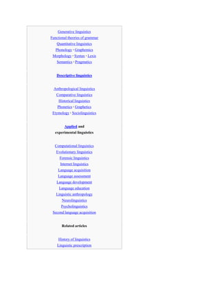 - Transformational grammar analyzes sentences as having deep and surface structures, with transformations mapping between them. This allows it to generate an infinite set of sentences from a finite set of rules.