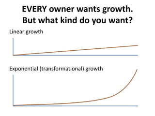 The document outlines 8 steps to bring transformational growth to a business: 1) Decide you want exponential growth and what you're willing to change to achieve it, 2) Write down your goals and dreams clearly, 3) Share your dreams with others to gain support and input, 4) Take daily action towards your goals through planning, sharing ideas, etc, 5) Continuously learn new skills, 6) Regularly celebrate progress and accomplishments, 7) Track your progress towards milestones, and 8) Help others along their journey by sharing experiences and advice. The author emphasizes that transformational growth requires daily discipline and following simple steps consistently over time.