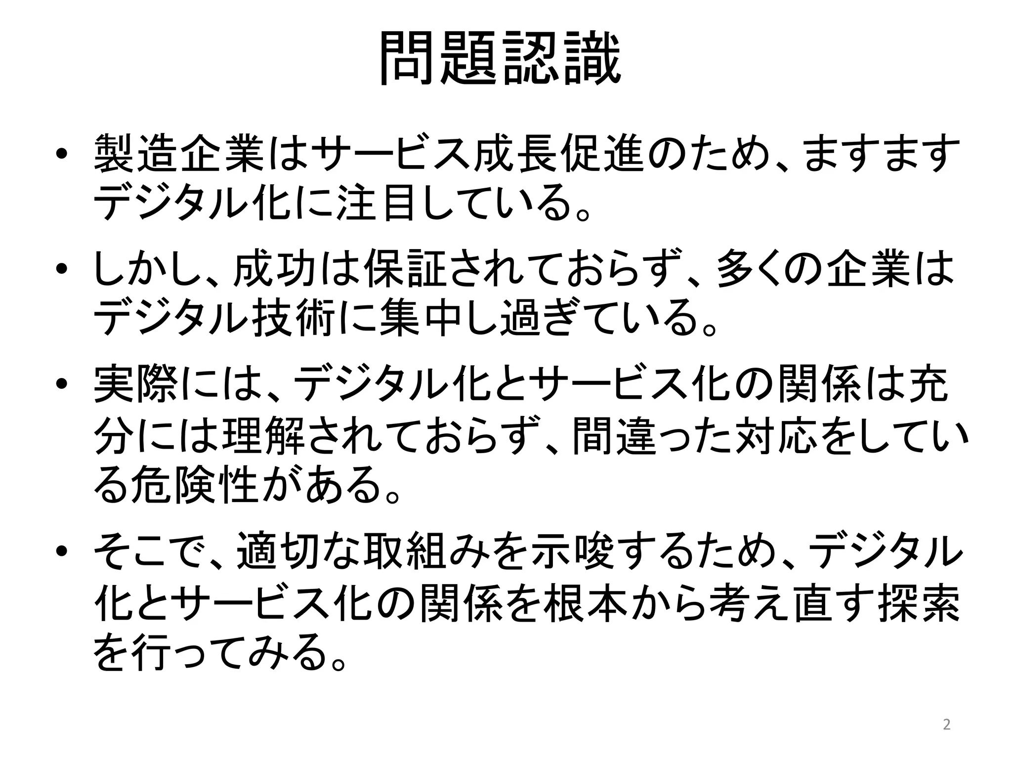 昨今、多くの製造企業はデジタルサービス化を目指している。但し、デジタル化とサービス化は、実際にはそれぞれの性格を持ち、容易には統合されない性質も持っている。そして、両者の関係は学術的にもあまり整理されていない状況にある。そして、現在のビジネス環境はこのような状況の早期克服を求めている。そこで、代表的な先行企業を選定し、その企業に対する詳細なインタビューから見出された私見をまとめて、これからのデジタルサービス化への取組みの指針を提供する。