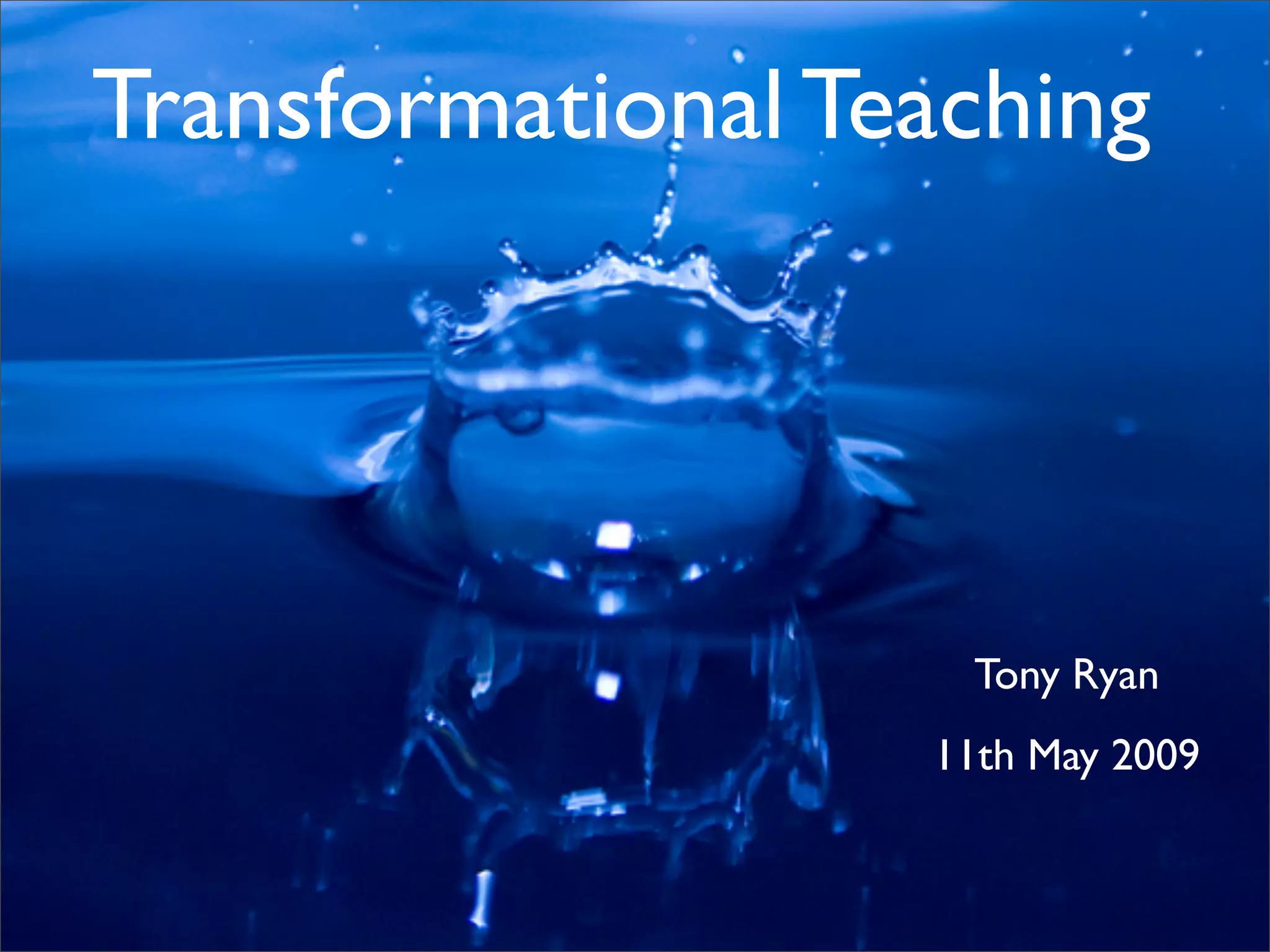 This document discusses transformational teaching and learning. It covers topics like altered paradigms of life and learning due to increased lifespans and technology, different levels of learning from no change to transformation, the changing face of learning delivery including personalized learning and ICT integration, developing key competencies like thinking, language use, self-management, and contributing to local and global causes. It also provides questions to reflect on teaching skills, inspiration, thinking, digital learning, and engaging in professional dialogue.