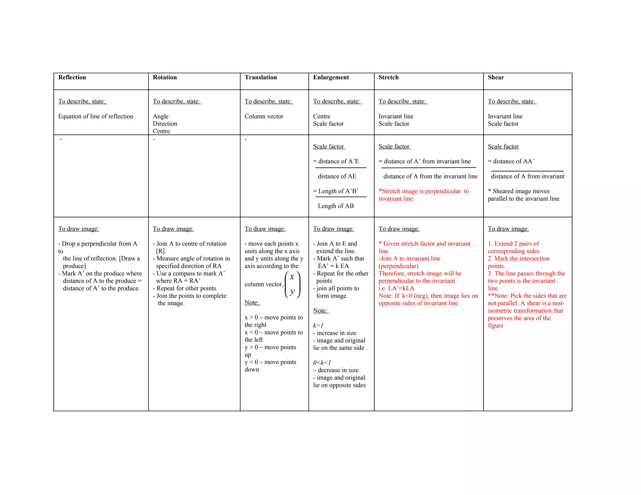 This document describes six geometric transformations: reflection, rotation, translation, enlargement, stretch, and shear. For each transformation it provides: