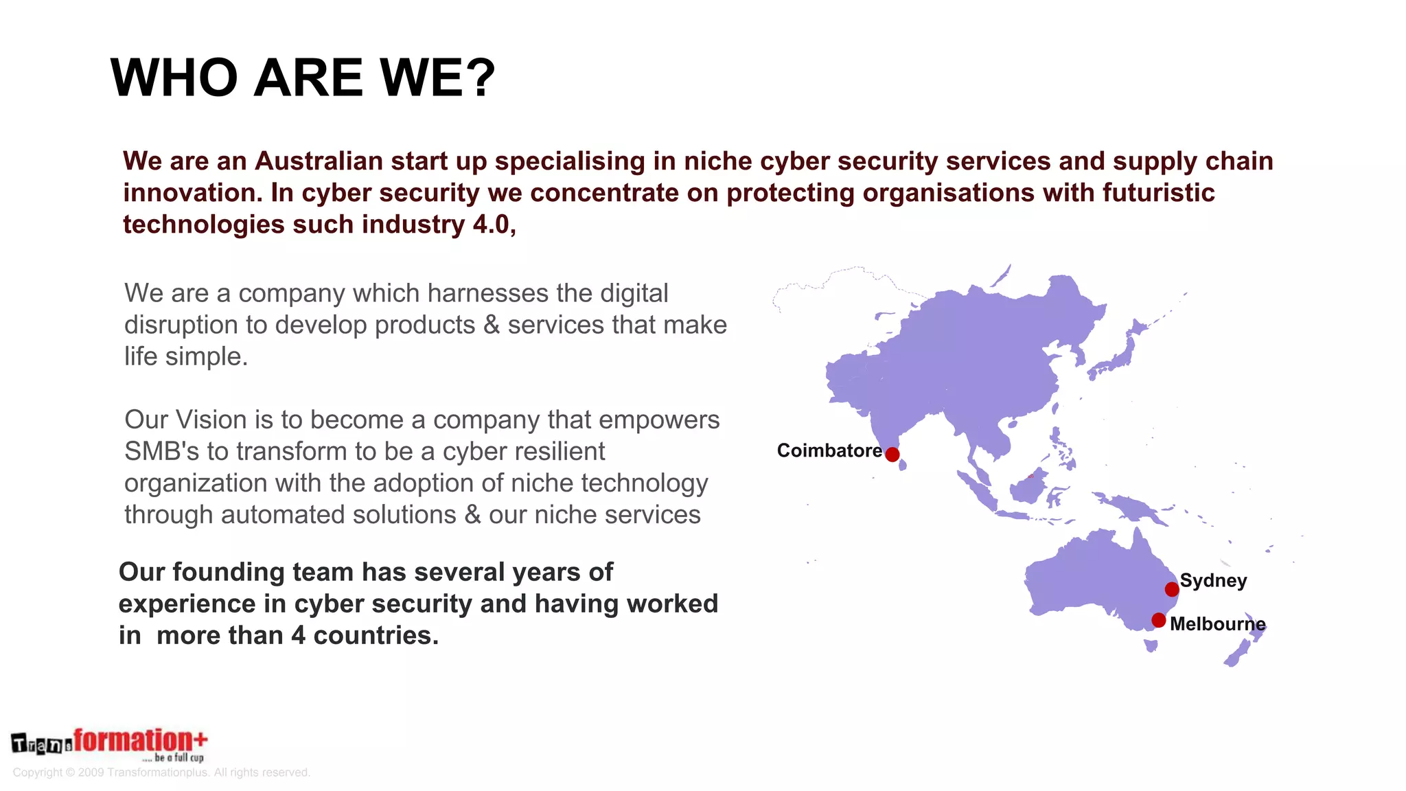 This document summarizes the cybersecurity offerings of Transformationplus, an Australian startup specializing in cybersecurity services and supply chain innovation. It describes an automated cyber officer product that acts as an organization's cybersecurity officer, managing supplier security assessments, risk and compliance, and certifications. It also describes a cybersecurity as a service offering called Secure+ that manages cybersecurity through governance, design, implementation, maintenance, and testing for clients. The document provides information on the company's experts, accreditations, testimonials, and contact information.