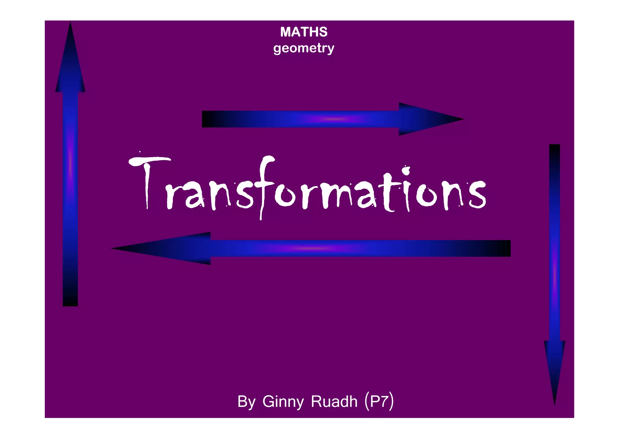 This document discusses different types of transformations in geometry: reflections, translations, and rotations. Reflections involve flipping a shape across a mirror line. Translations involve sliding a shape without turning or flipping. Rotations involve turning a shape around a central point by degrees or fractions of a full turn. All of these transformations produce a new position for the shape while keeping its size, angles, and measurements the same. Tracing paper is recommended for helping to rotate shapes accurately.