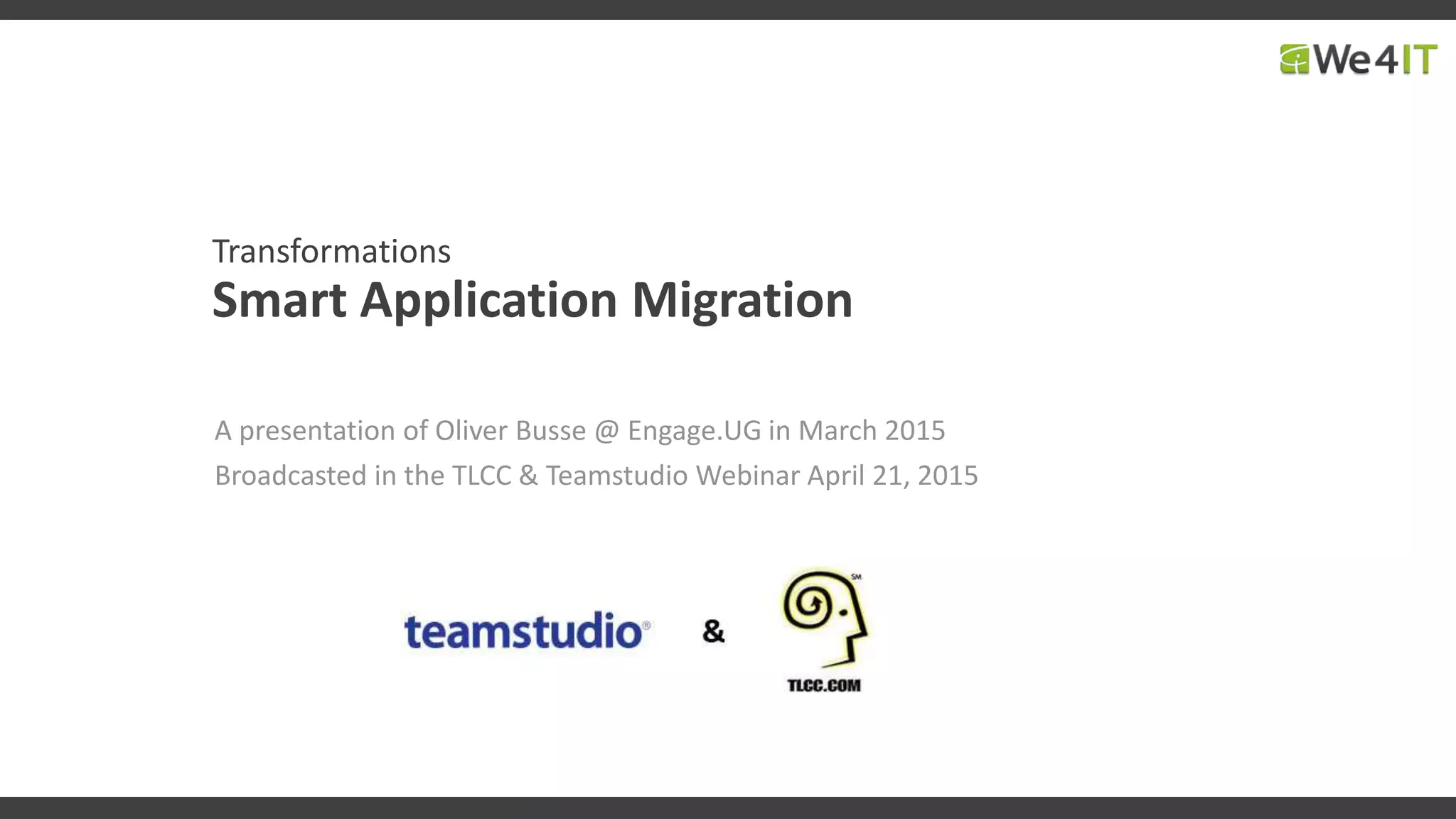 The document presents Oliver Busse's insights on smart application migration, focusing on transforming legacy patterns in XPages and database profiles. It covers key concepts such as migrating user profiles, the use of Java beans, and techniques for faceted search. Additionally, it includes practical examples and resources for further exploration of the discussed topics.