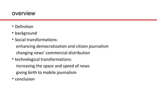 The document discusses the social and technological transformations of digital journalism. Socially, digital journalism has enhanced democratization by allowing greater citizen participation and the rise of citizen journalism. It has changed the commercial distribution of news by threatening traditional models. Technologically, digital journalism has increased the speed and space of news distribution and given rise to mobile journalism through smartphones. Overall, digital journalism is transforming the industry through greater interactivity, new business models, and ubiquitous mobile access to information.