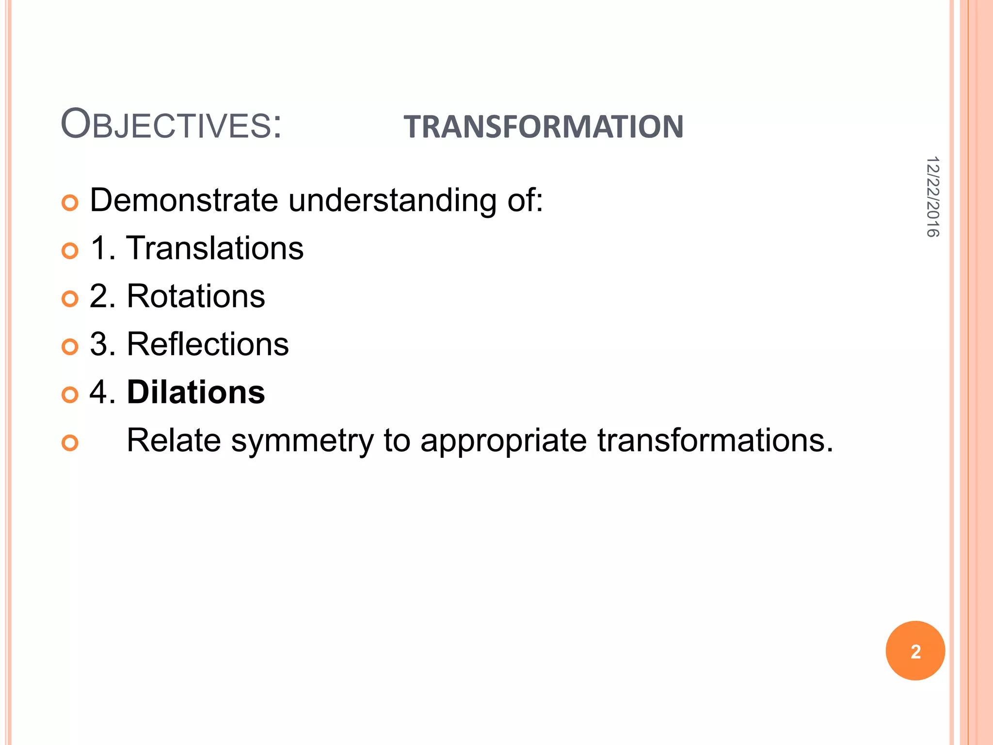 This document discusses the geometric transformation of dilation. Dilation changes the size of a shape but not its shape. Dilation is specified by a scale factor, where a scale factor greater than 1 enlarges the shape and less than 1 reduces the shape. Examples are given of dilating shapes at scale factors of 75%, 150%, and 100%. Real-world examples of dilation include enlarging photographs and reducing maps on a photocopier. The key aspects of dilation are explained, including that it changes the size but not the shape using a scale factor to specify the amount of enlargement or reduction.