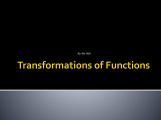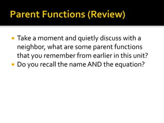 The document discusses function transformations including shifts, reflections, and stretches/compressions. It defines these transformations and provides examples of how they affect the graph of a function. Specifically, it explains that a shift moves a graph up/down or left/right along an axis, a reflection flips the graph across an axis, and a stretch or compression changes the scale of the graph along an axis. Examples are given of reflecting across the x-axis or y-axis and horizontally or vertically stretching/compressing a function. In the end, students are asked to write equations for specific transformations of a quadratic function.