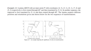Geometric transformations change an object's position, orientation, or size. There are several types of 2D and 3D transformations, including translation, rotation, scaling, shearing, and their composition. Transformations can be represented using transformation matrices in homogeneous coordinates, where each point corresponds to a line. Special cases include rigid, similarity, and affine transformations that preserve certain properties like angles, lengths, and parallelism.