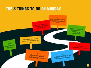 Emerging economies are projected to significantly increase their share of Fortune Global 500 companies by 2025, reflecting their agility and long-term investment strategies. The document emphasizes the importance of understanding customer needs, fostering innovation, and building partnerships to drive market growth and create societal value. Techniques for innovation are outlined, including focusing on core strengths, leveraging existing networks, and the establishment of innovation labs to refine ideas into financially viable solutions.