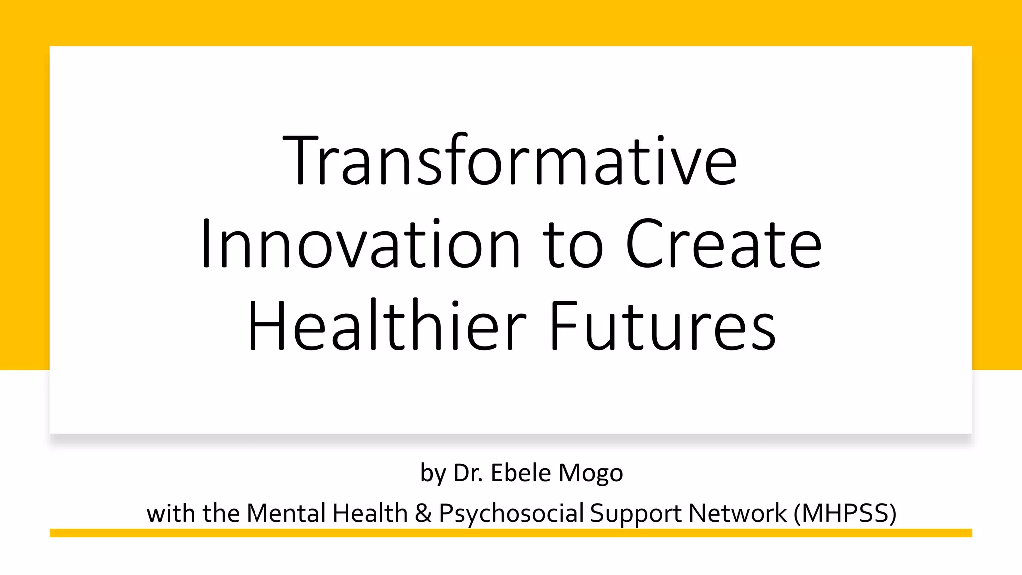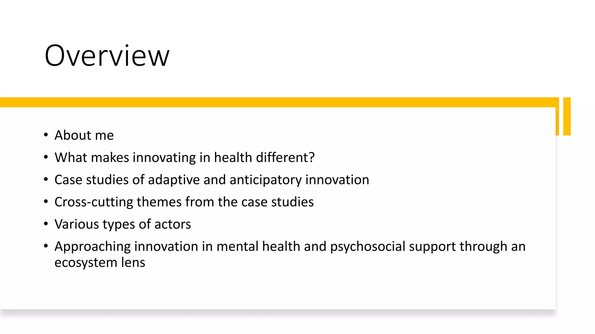 This document discusses transformative innovation in health and mental health. It provides an overview of adaptive and anticipatory innovation case studies and discusses cross-cutting themes. Innovation is defined as tools, processes, and approaches that allow for more effective problem solving and create new value. The case studies show examples of innovations that address current needs through adaptive approaches and future needs through anticipatory approaches. Common themes include taking a future orientation, moving from static to embedded data collection, improving access through supply-side innovations, and stimulating innovation through demand-side levers. Various actors like government, private sector, international organizations, and research institutions each have opportunities and challenges to play a role in innovation ecosystems. An ecosystem lens considers activities, investments, interventions,